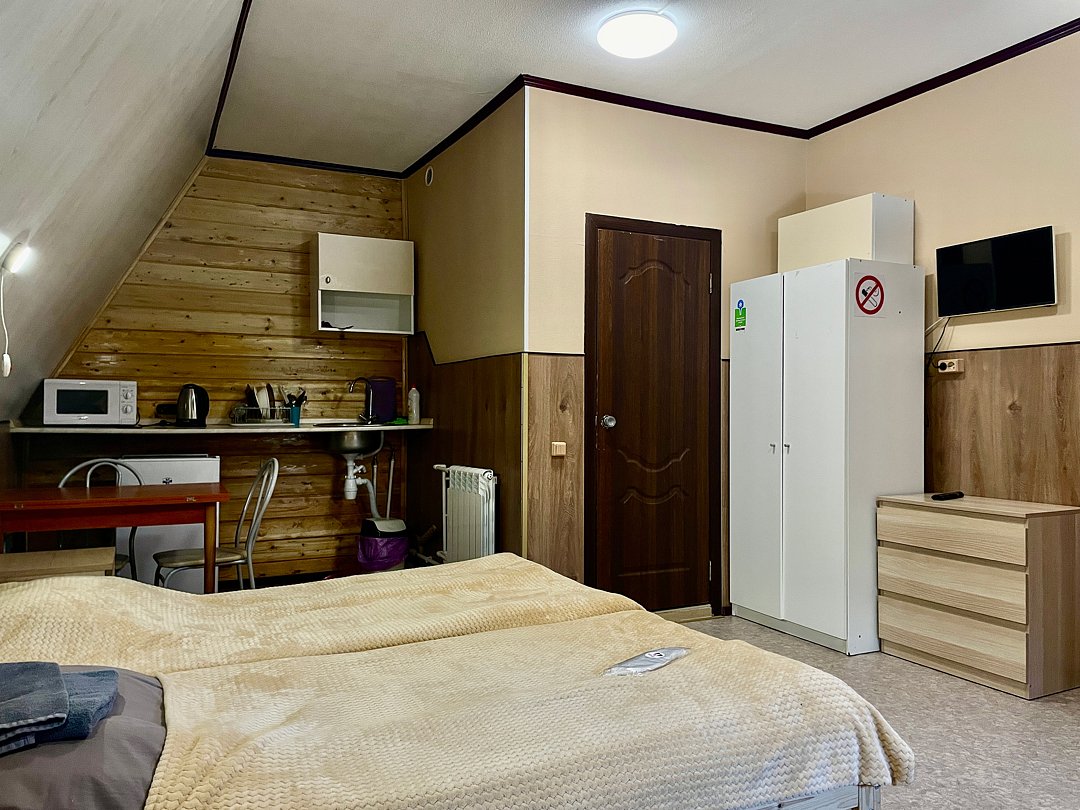 Размер 22 - 24 кв. м. Апартаменты категории комфорт в которых имеется: одна двуспальная кровать и одна односпальная, шкаф, прикроватные тумбы, бра, центральное отопление, зеркало, чайник, холодильник, телевизор, микроволновая печь, мультиварка, посуда, санузел. Вход в апартаменты осуществляется с улицы.