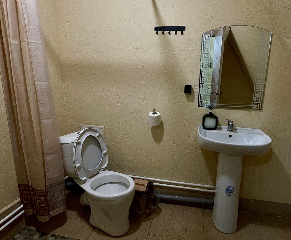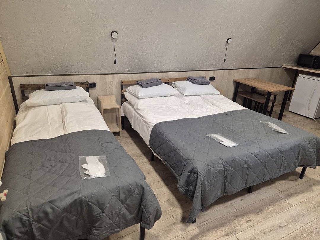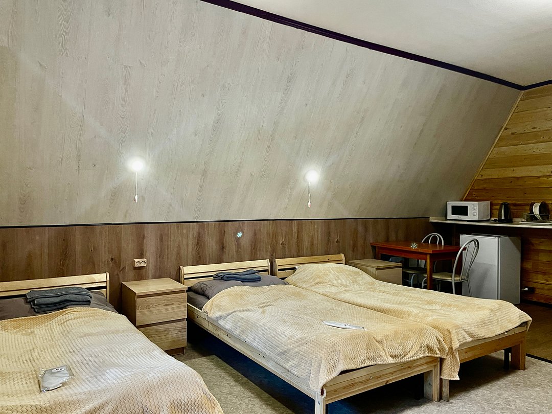 Размер 22 - 24 кв. м. Трёхместные апартаменты в которых имеется: три односпальные кровати, шкаф, прикроватные тумбы, бра, центральное отопление, зеркало, чайник, холодильник, телевизор, микроволновая печь, посуда, санузел. Вход в апартаменты осуществляется с улицы.