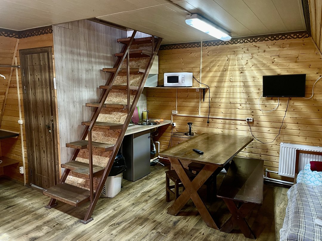 Размер 45 - 47 кв. м. Двухэтажные апартаменты типа «Коттедж» в которых имеется: пять односпальных кроватей. На первом этаже три односпальные кровати кровати, центральное отопление, телевизор, чайник, микроволновая печь, холодильник, посуда, санузел. На втором этаже две односпальные кровати. Вход в апартаменты осуществляется с улицы.