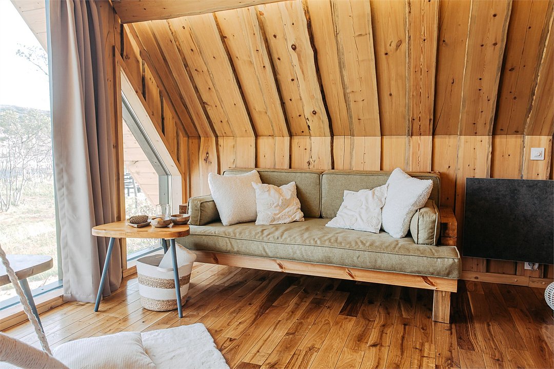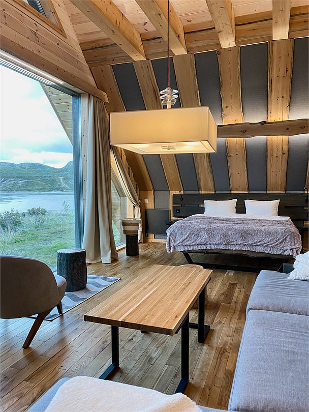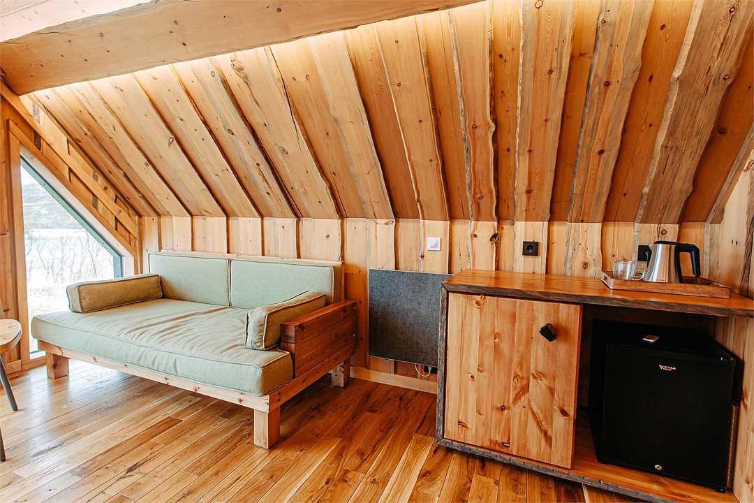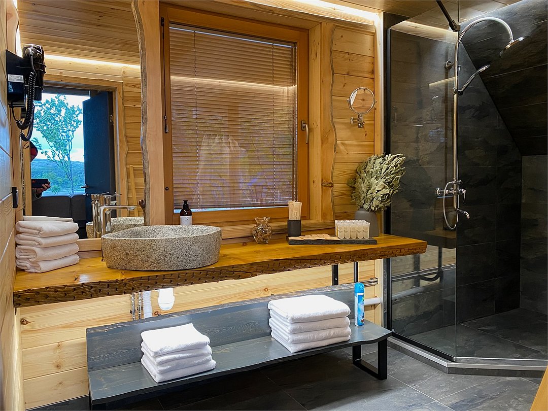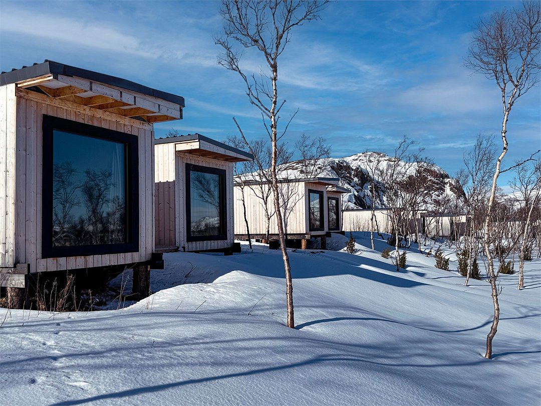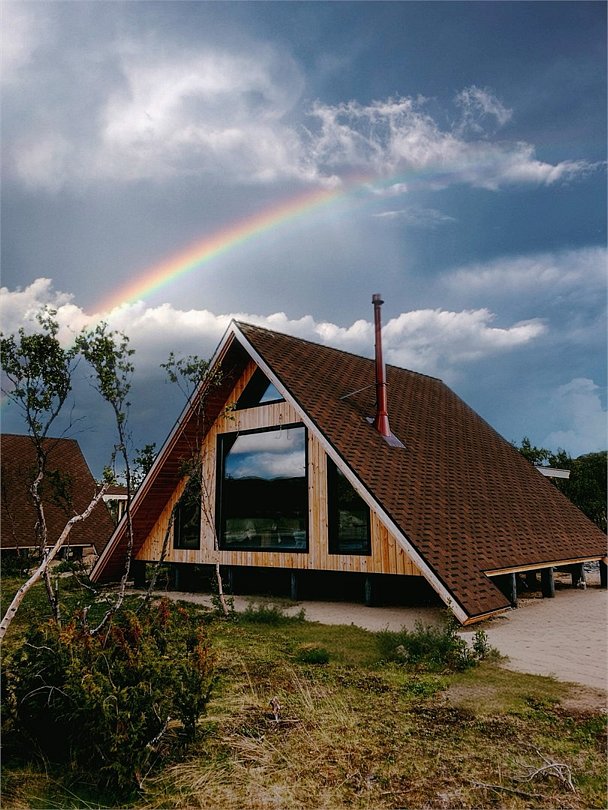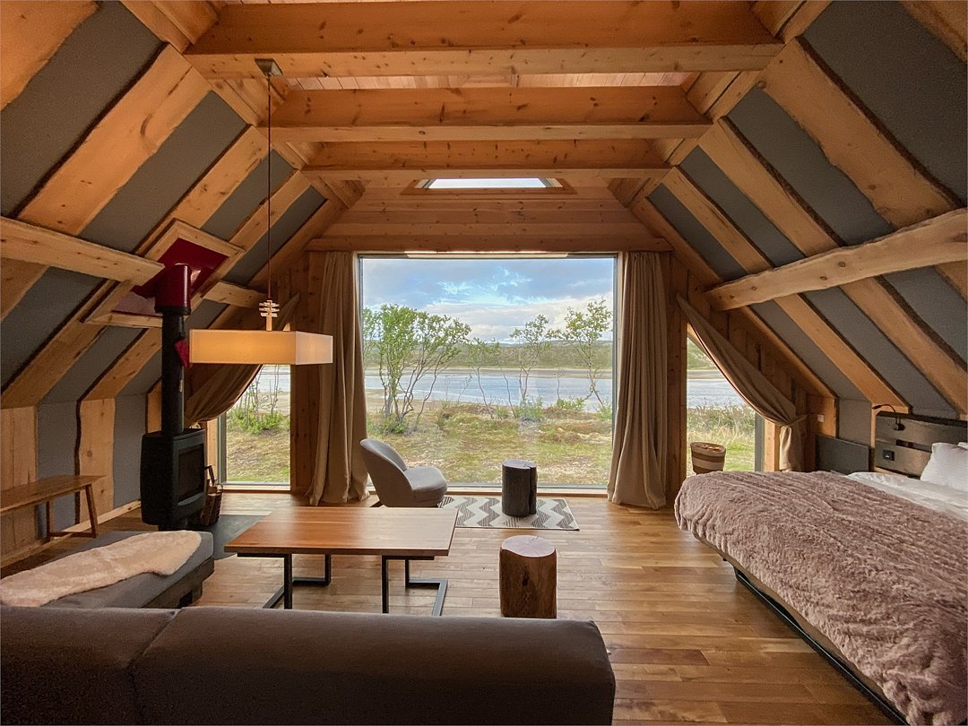 На территории расположены современные двухэтажные коттеджи. Коттеджи представлены в стильном интерьере, с удобной мебелью, камином и мини-кухней, оснащенная всей необходимой техникой. Дополнительно в домах установлена система общего кондиционирования, а панорамные окна открывают прекрасные виды на северную природу.