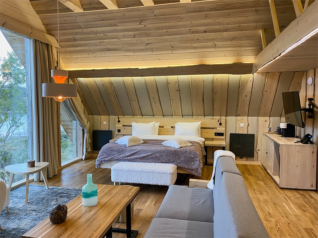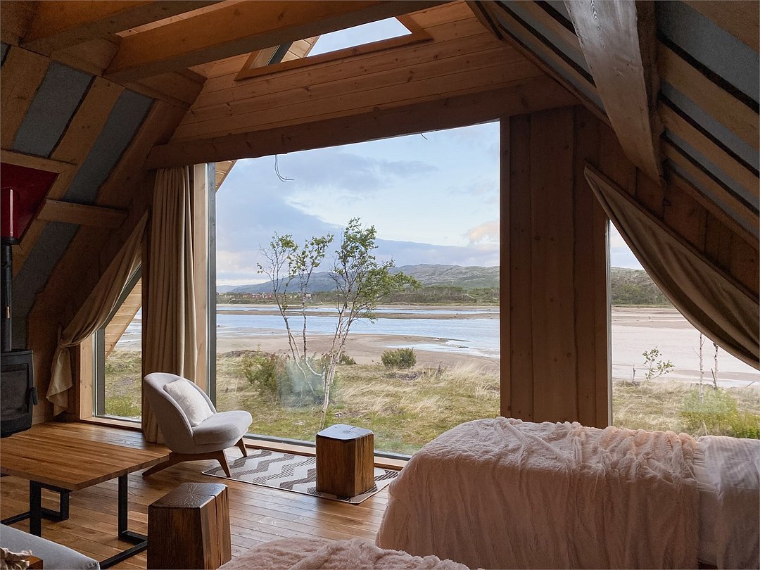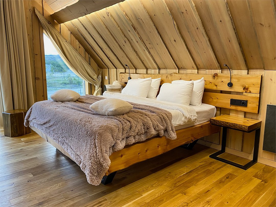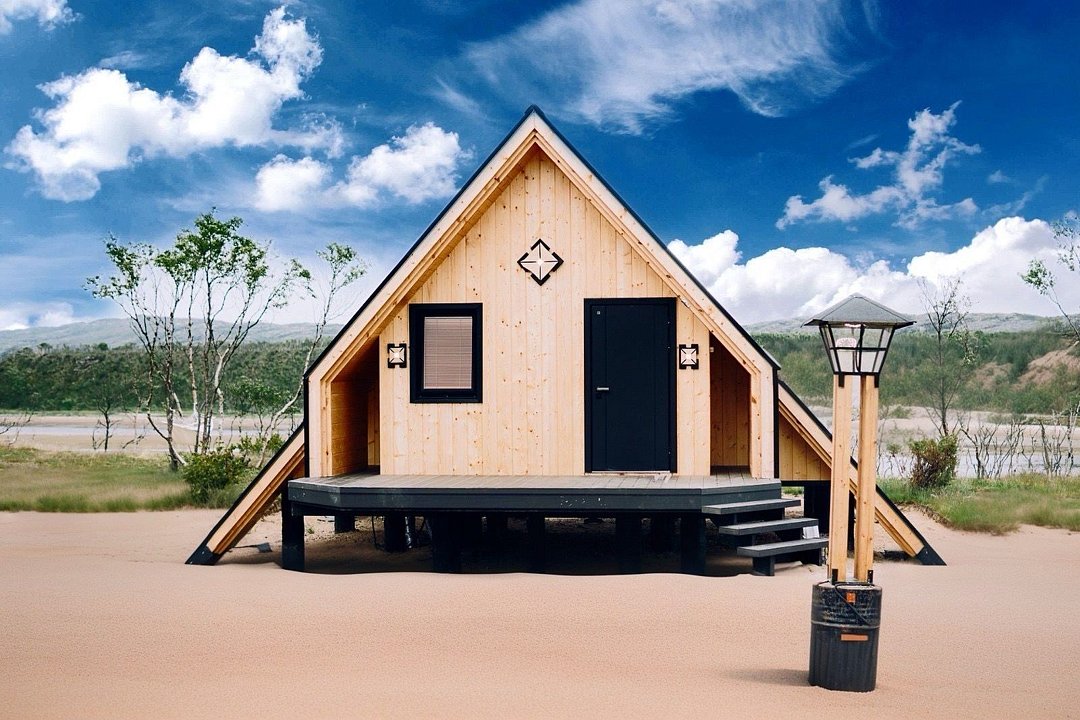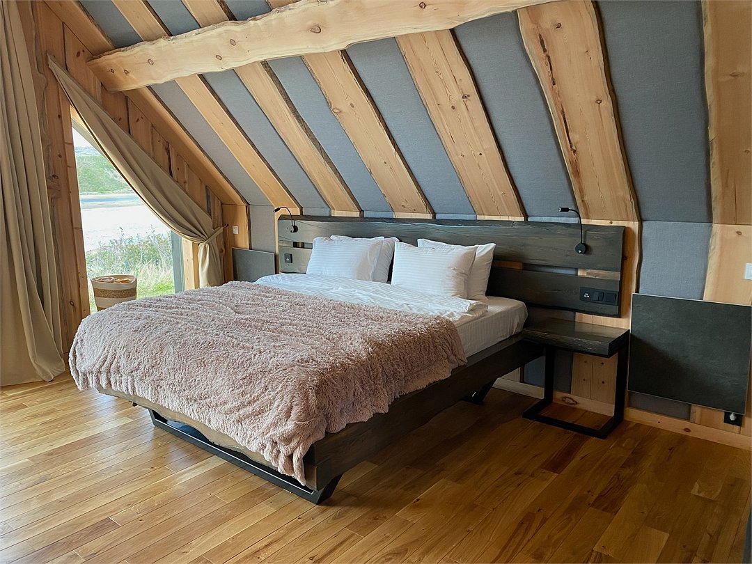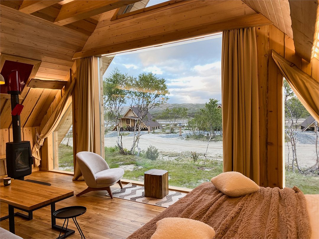 На территории расположены современные двухэтажные коттеджи. Коттеджи представлены в стильном интерьере, с удобной мебелью, камином и мини-кухней, оснащенная всей необходимой техникой. Дополнительно в домах установлена система общего кондиционирования, а панорамные окна открывают прекрасные виды на северную природу.