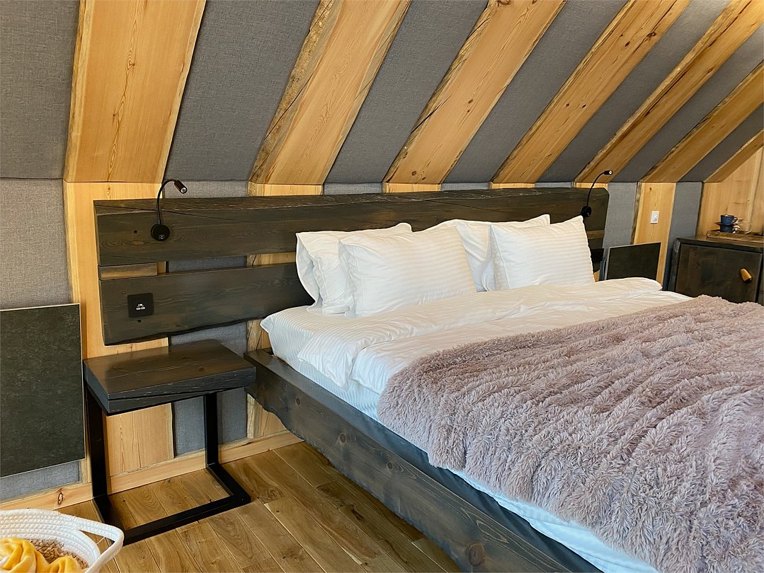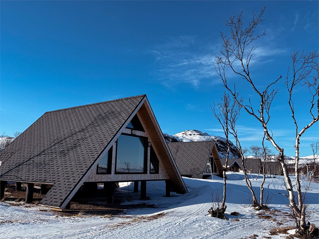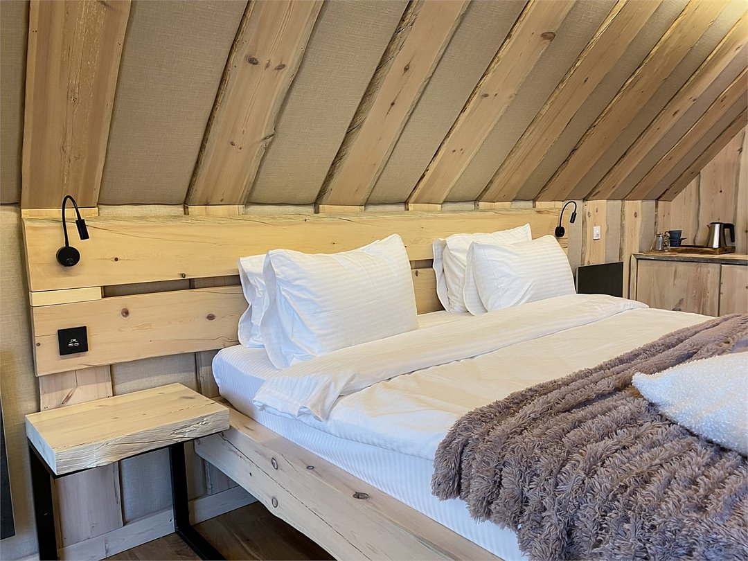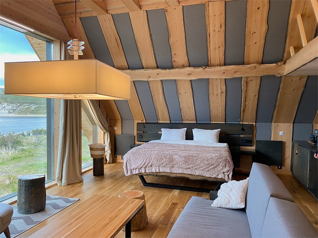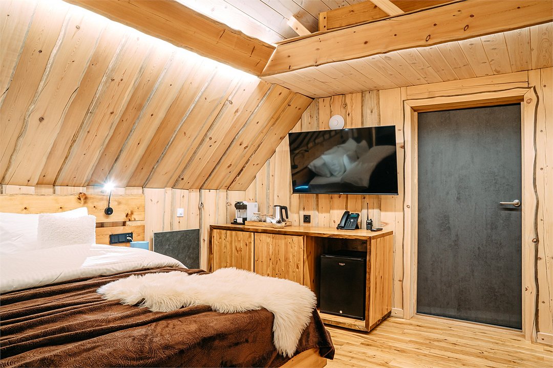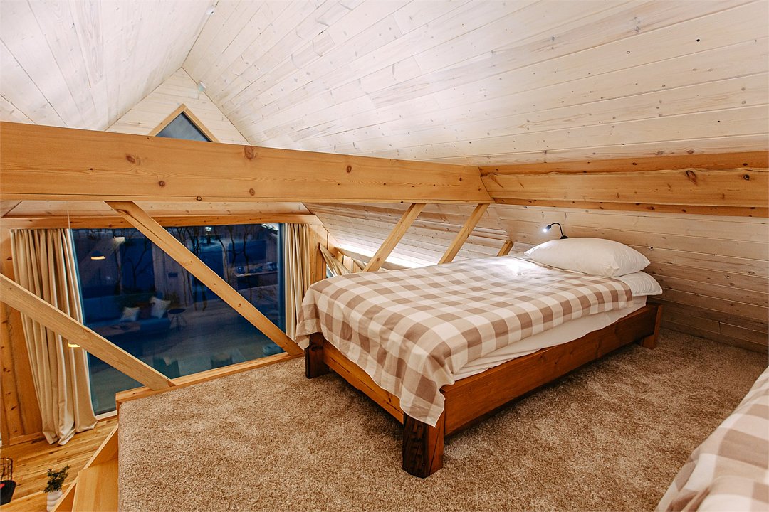 На территории расположены современные двухэтажные коттеджи. Коттеджи представлены в стильном интерьере, с удобной мебелью, камином и мини-кухней, оснащенная всей необходимой техникой. Дополнительно в домах установлена система общего кондиционирования, а панорамные окна открывают прекрасные виды на северную природу.