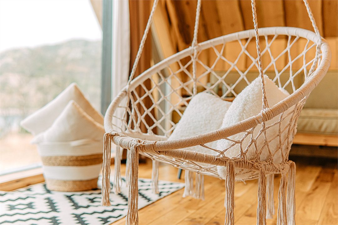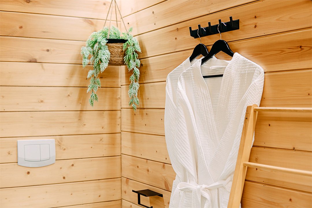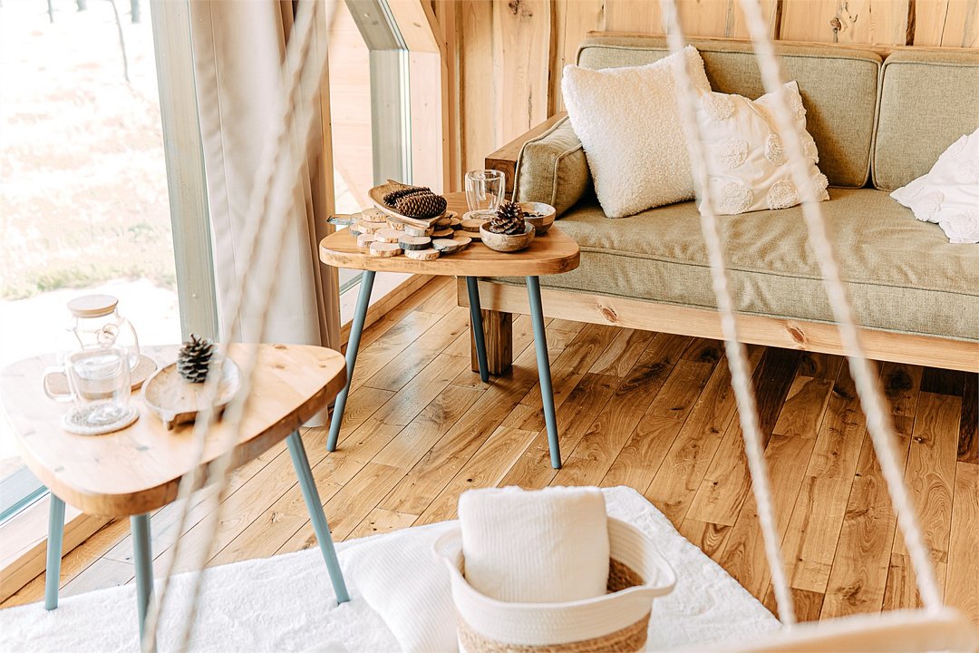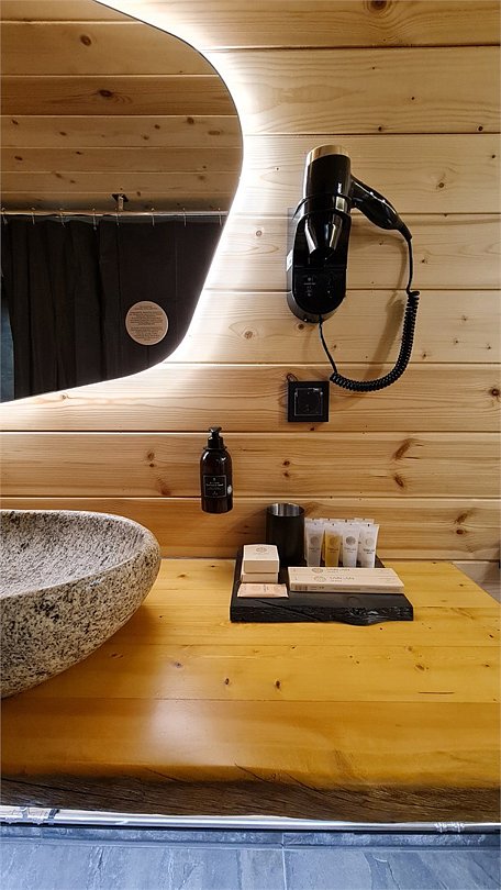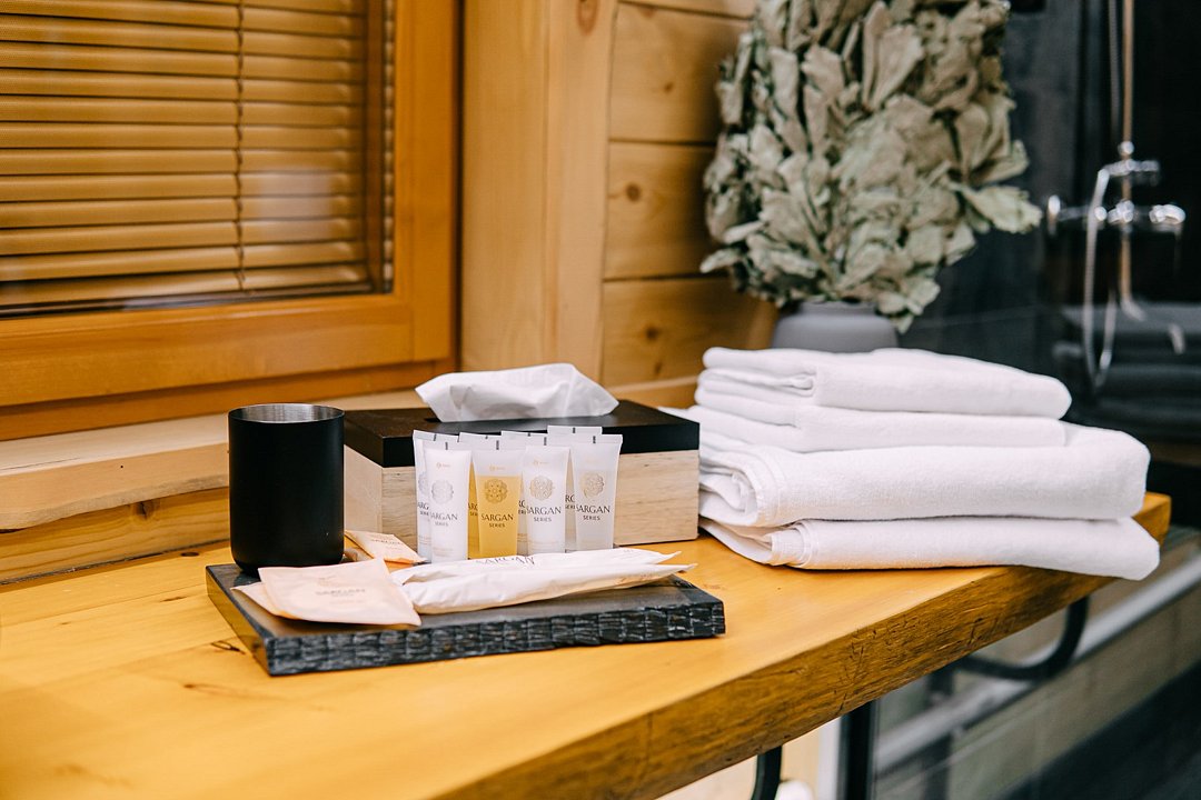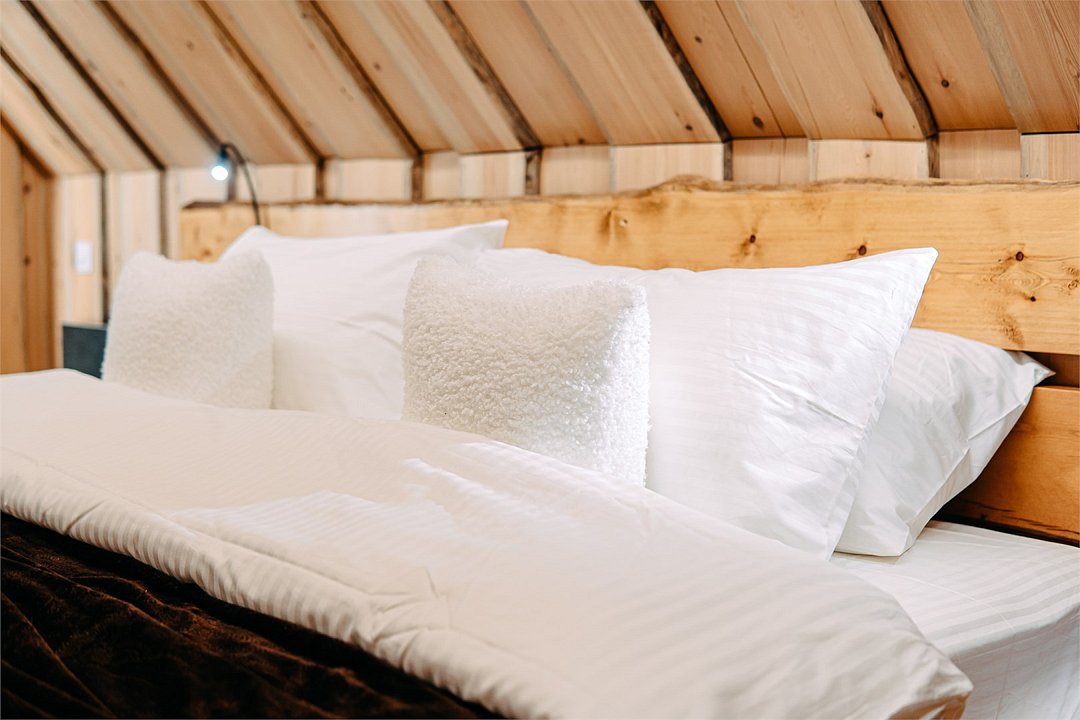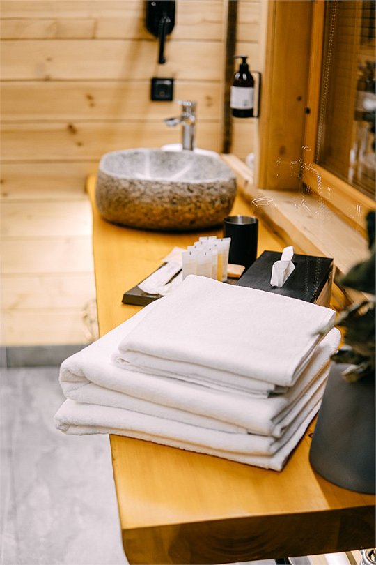На территории расположены современные двухэтажные коттеджи. Коттеджи представлены в стильном интерьере, с удобной мебелью, камином и мини-кухней, оснащенная всей необходимой техникой. Дополнительно в домах установлена система общего кондиционирования, а панорамные окна открывают прекрасные виды на северную природу.