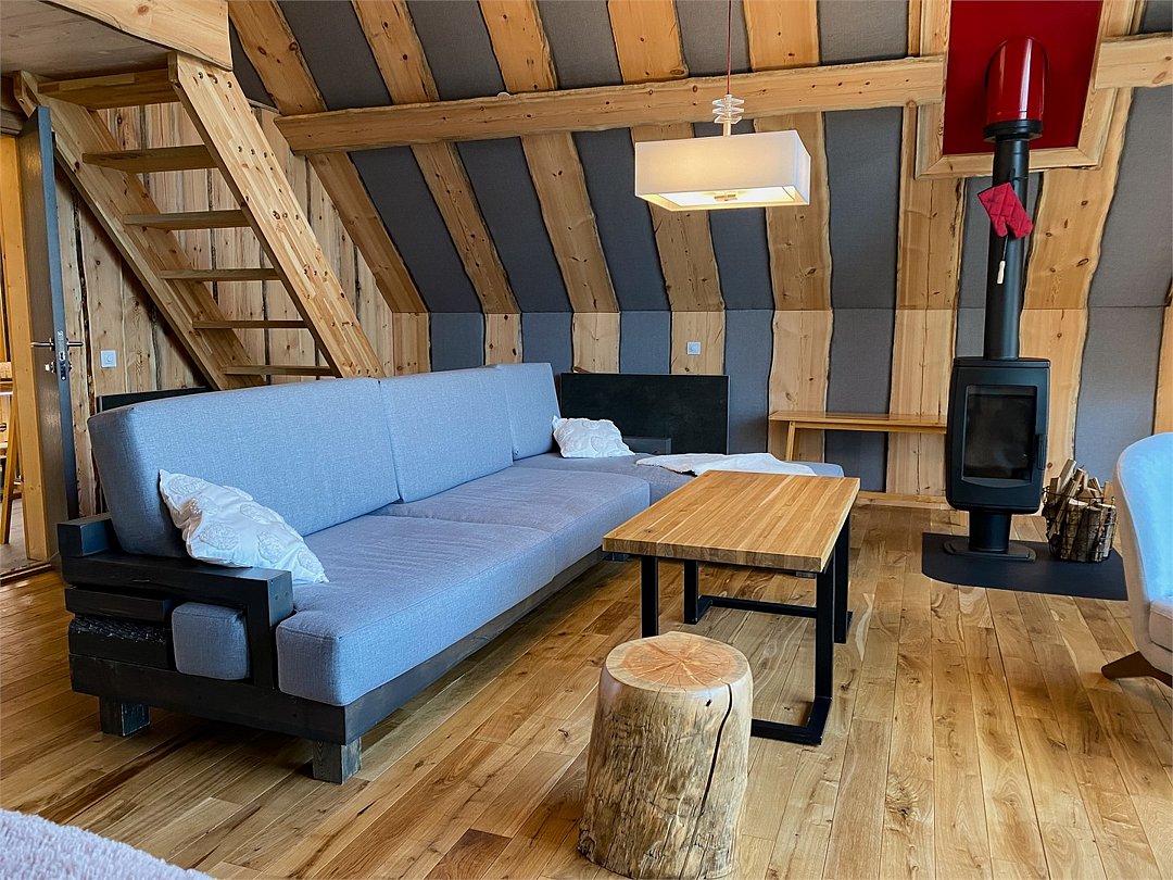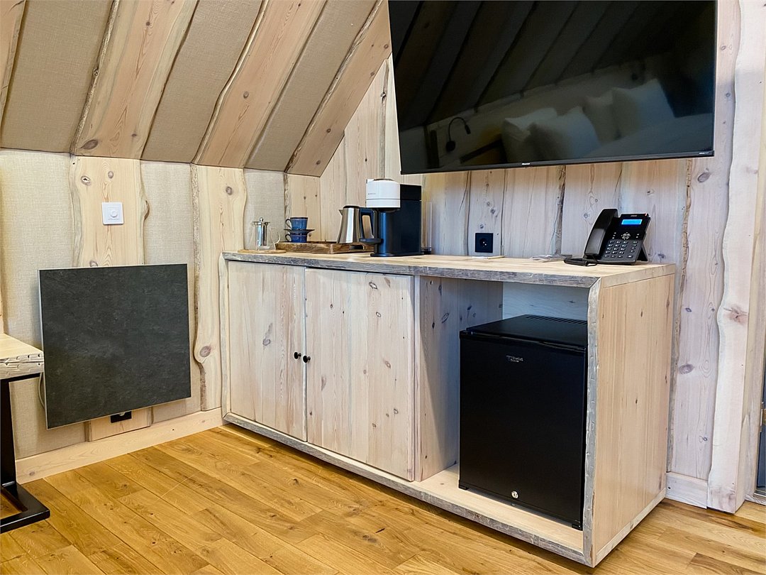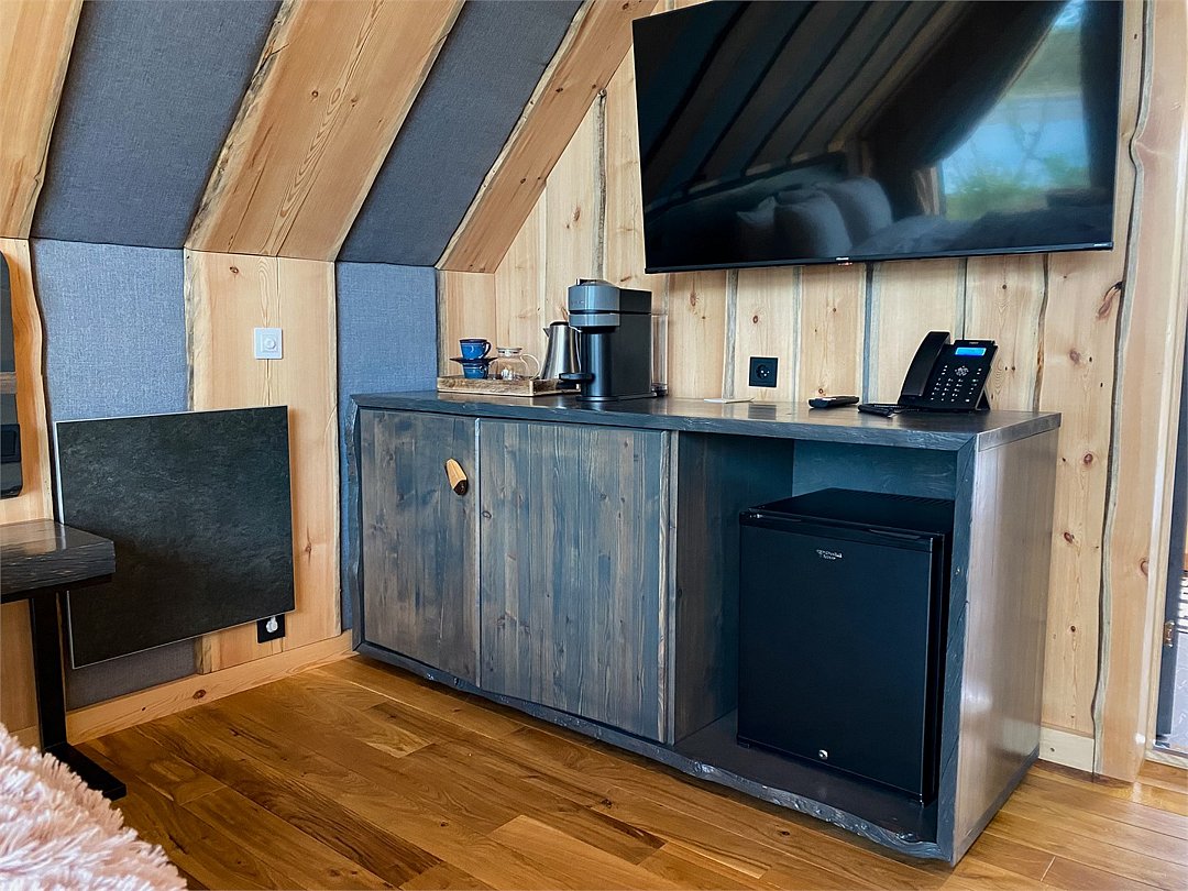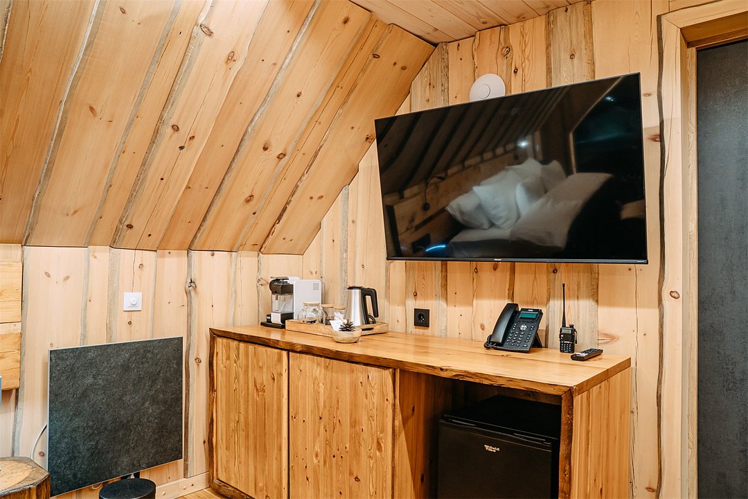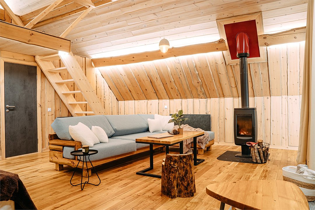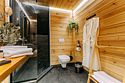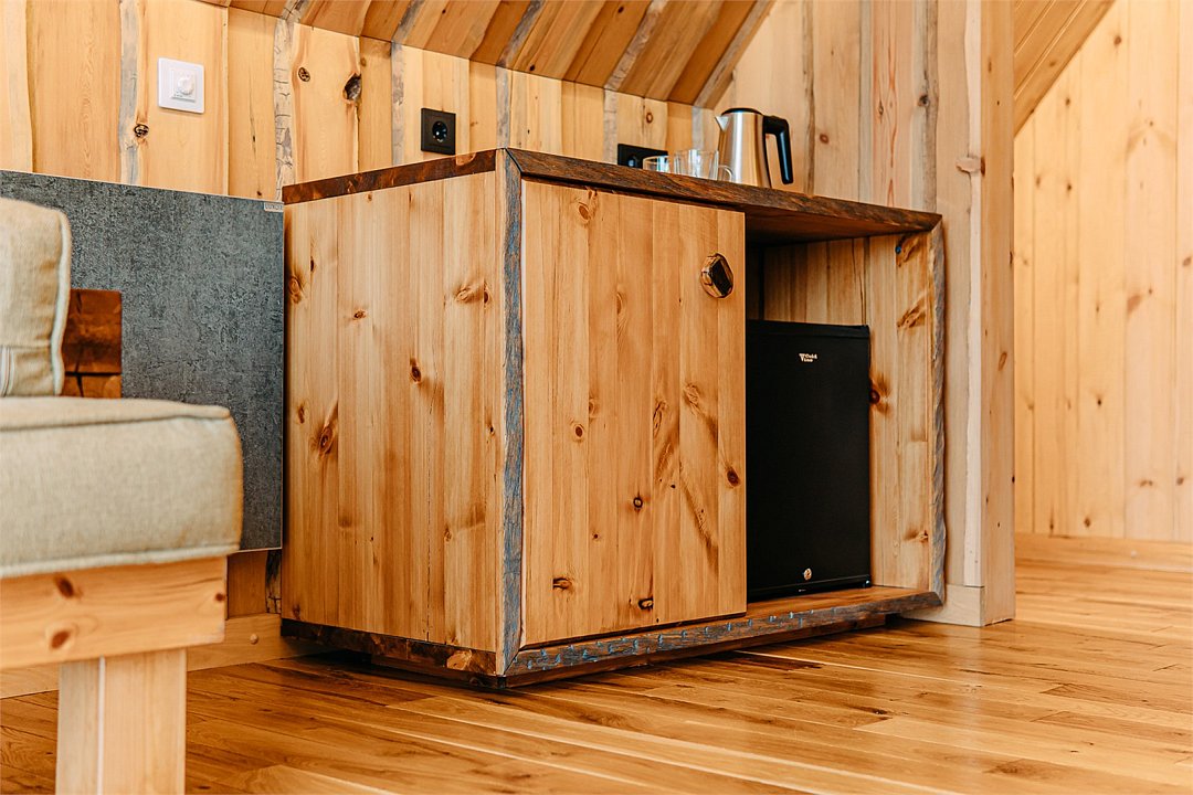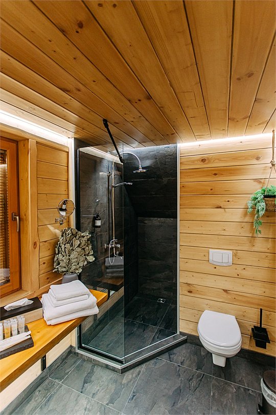 Просторный АРК-шале Премиум, оформленный с использованием натуральных материалов и оформленный авторской мебелью из редких пород древесины, оценят любители качественного отдыха на природе.
