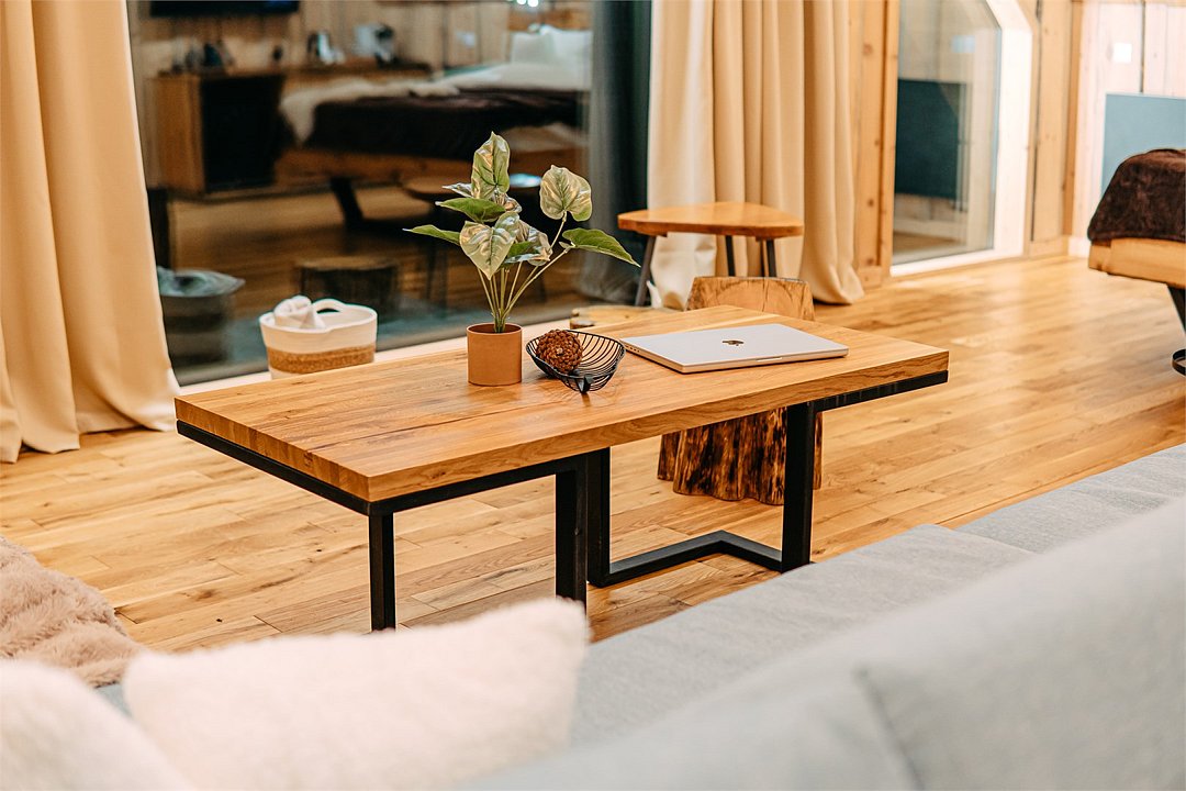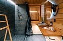 Просторный АРК-шале Премиум площадью, оформленный с использованием натуральных материалов и брутальной мебелью ручной работы из редких пород древесины, оценят любители качественного отдыха на природе.