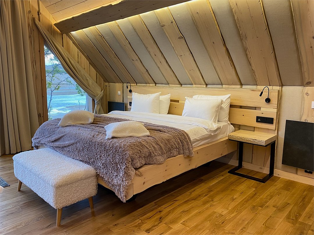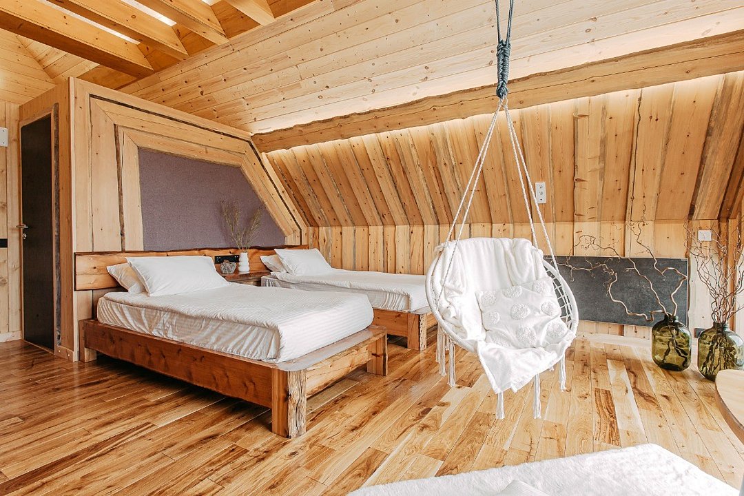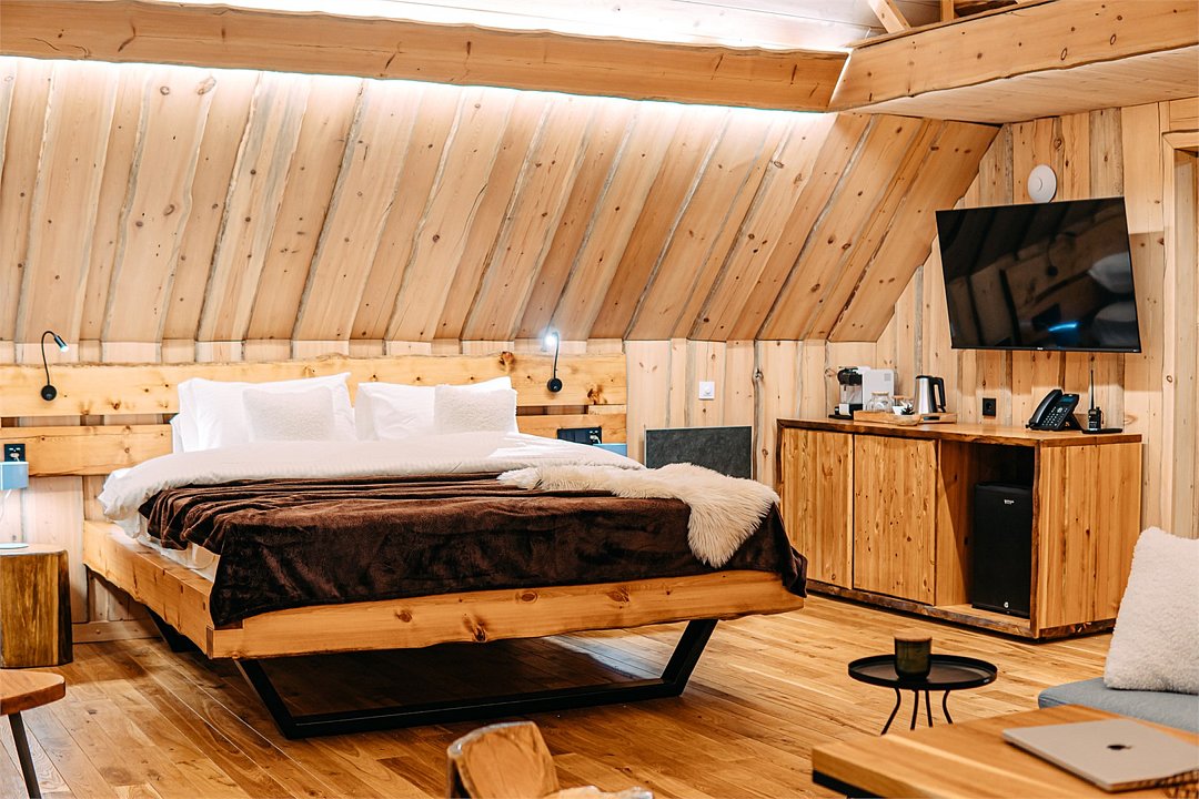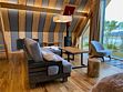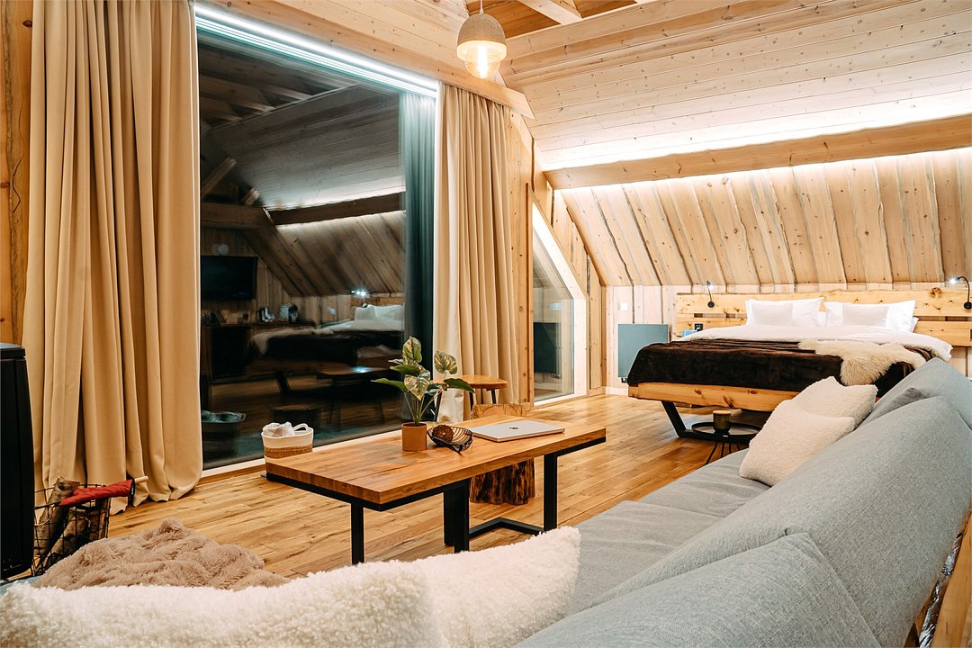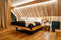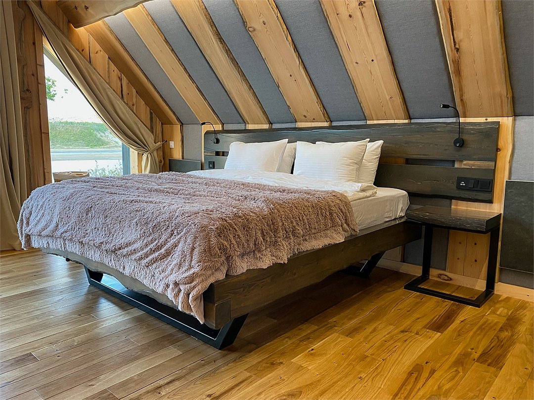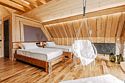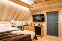 Просторный АРК-шале DBL площадью, оформленный с использованием натуральных материалов и белоснежная авторской мебелью из редких пород древесины, оценят любители качественного отдыха на природе.