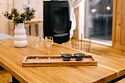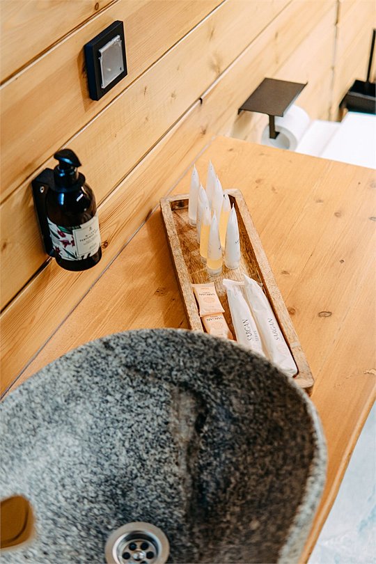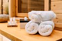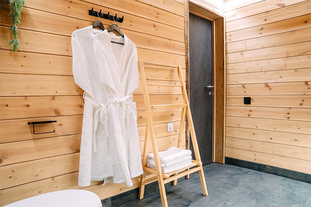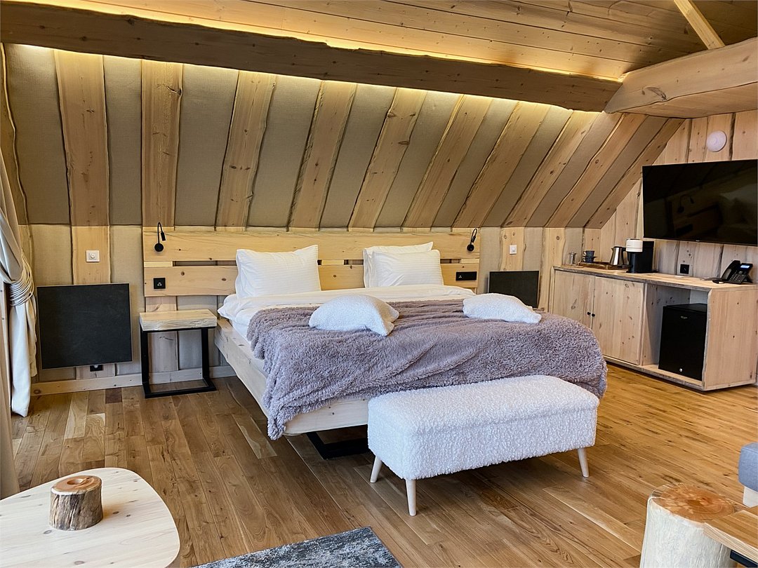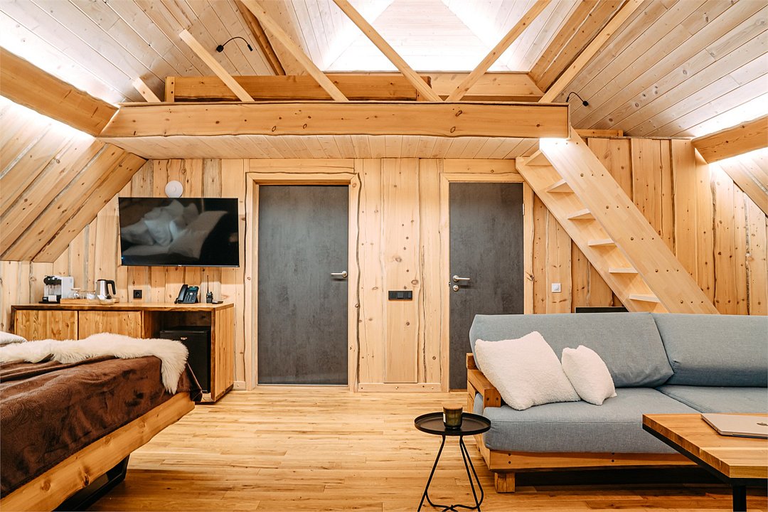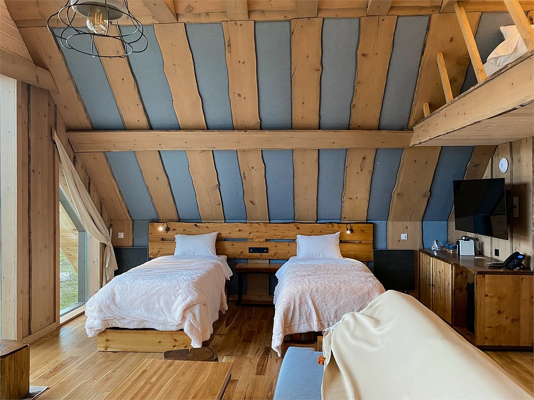 Просторный АРК-шале DBL площадью, оформленный с использованием натуральных материалов и белоснежная авторской мебелью из редких пород древесины, оценят любители качественного отдыха на природе.