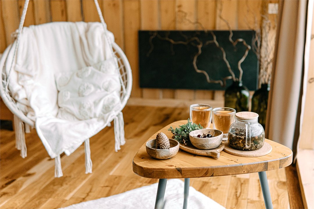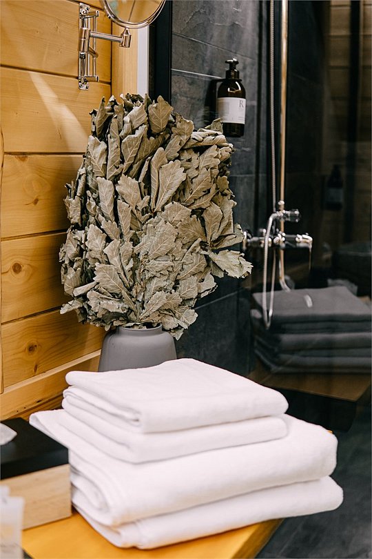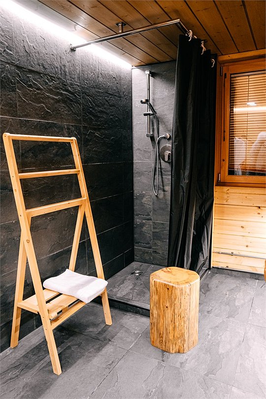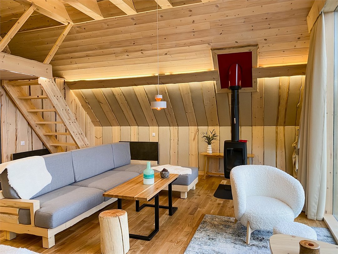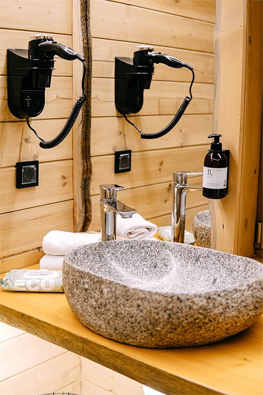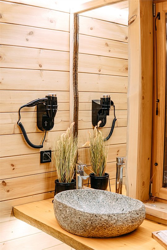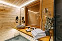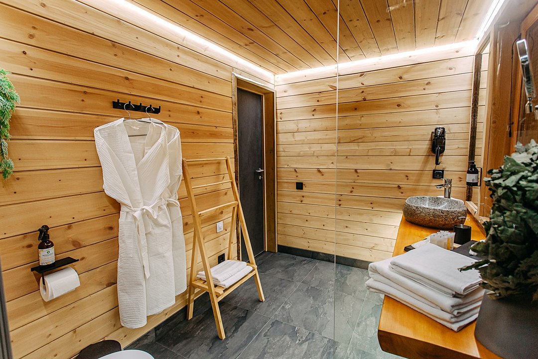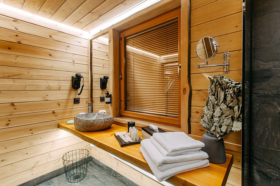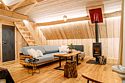 Просторный АРК-шале площадью 35 кв.м., оформленный с использованием натуральных материалов и декорированный предметами искусства и авторской мебелью, оценят любители шикарного отдыха на природе.