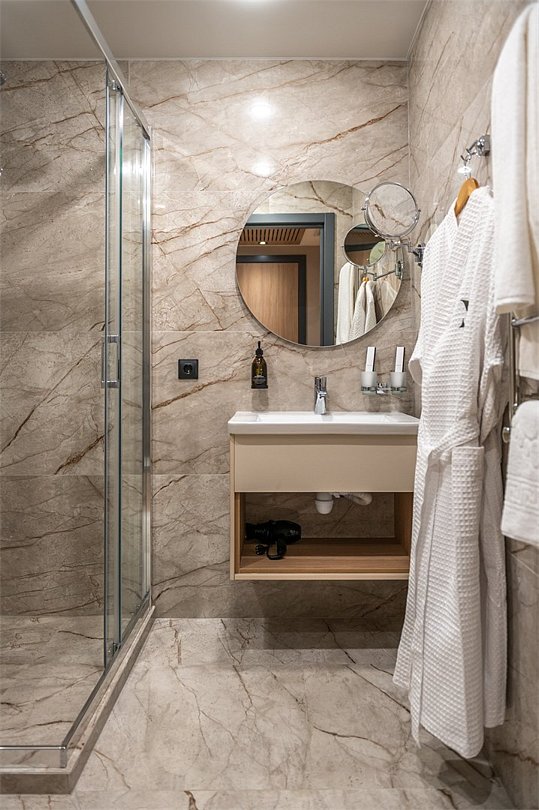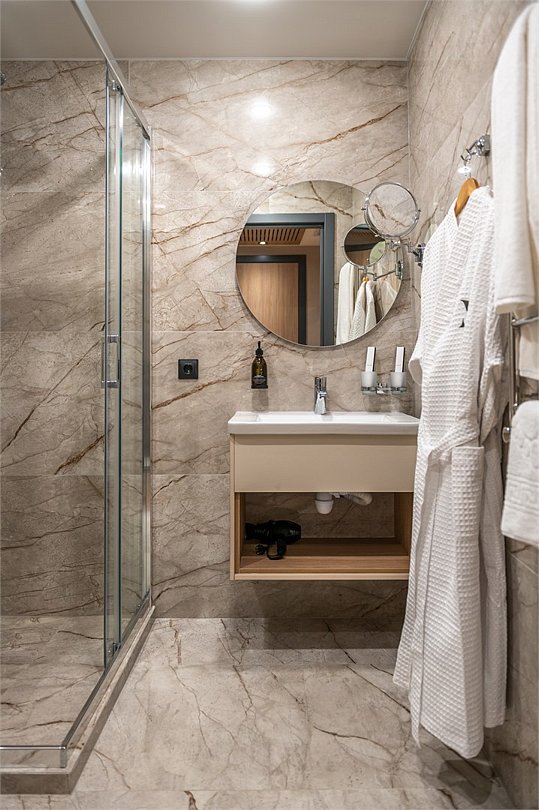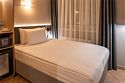 Уютный номер площадью 27 кв.м. Кровать KING SIZE (трансформер) с ортопедическим эффектом. В данном номере можно разместить дополнительное место, для бронирования необходимо связаться с менеджером. Телевизор с плоским экраном, кондиционер, сейф, телефон для внутренней связи в отеле, Wi-Fi, вода, чайный набор, мини-холодильник, ванная комната с душем, фен, косметические принадлежности, тапочки, полотенца, гладильные принадлежности.Услуги и удобства