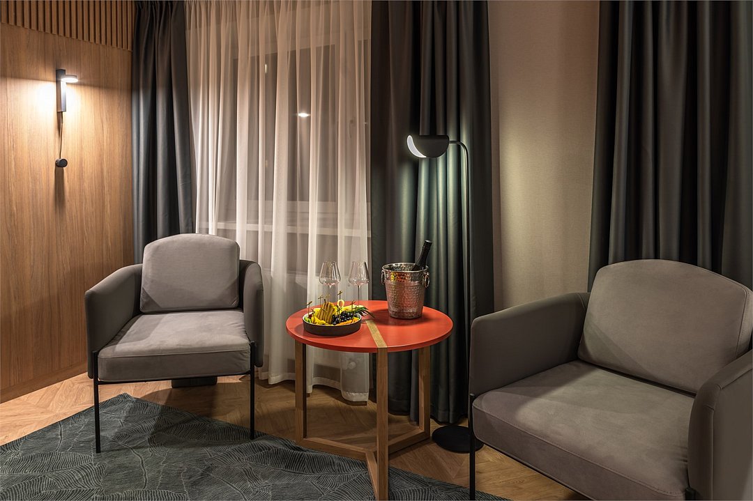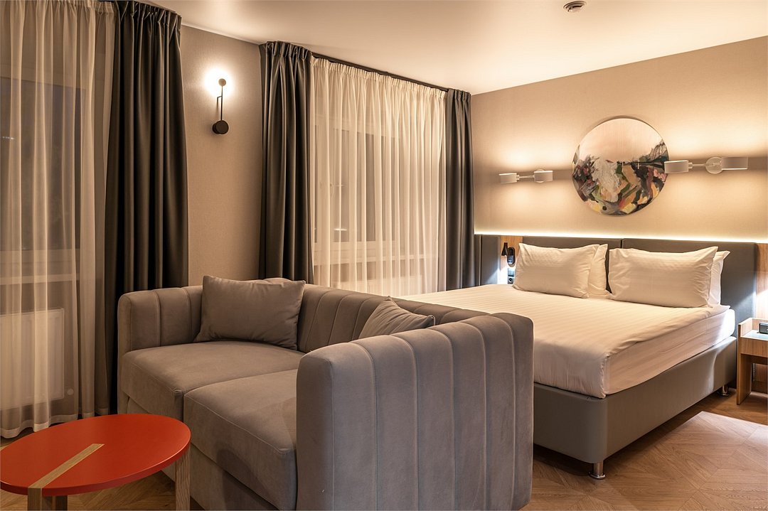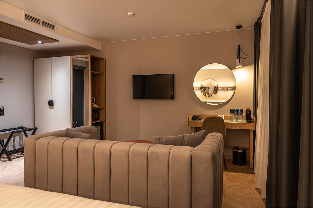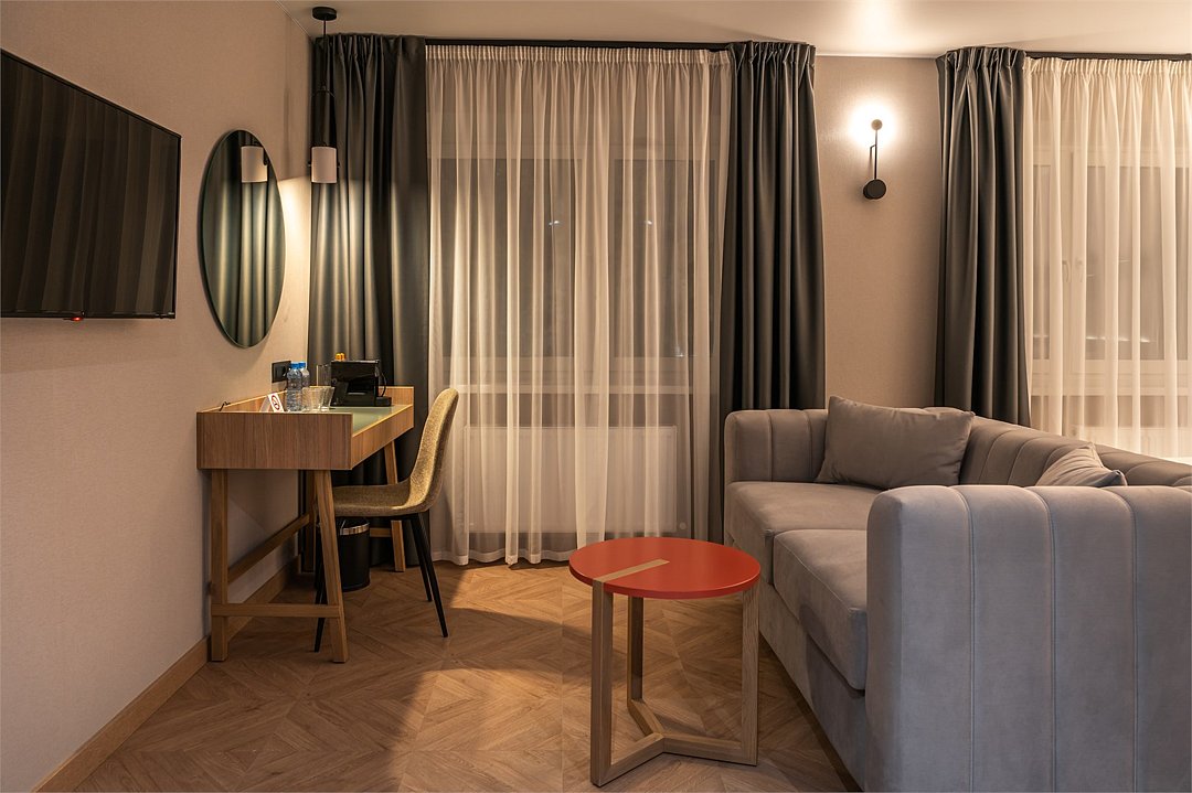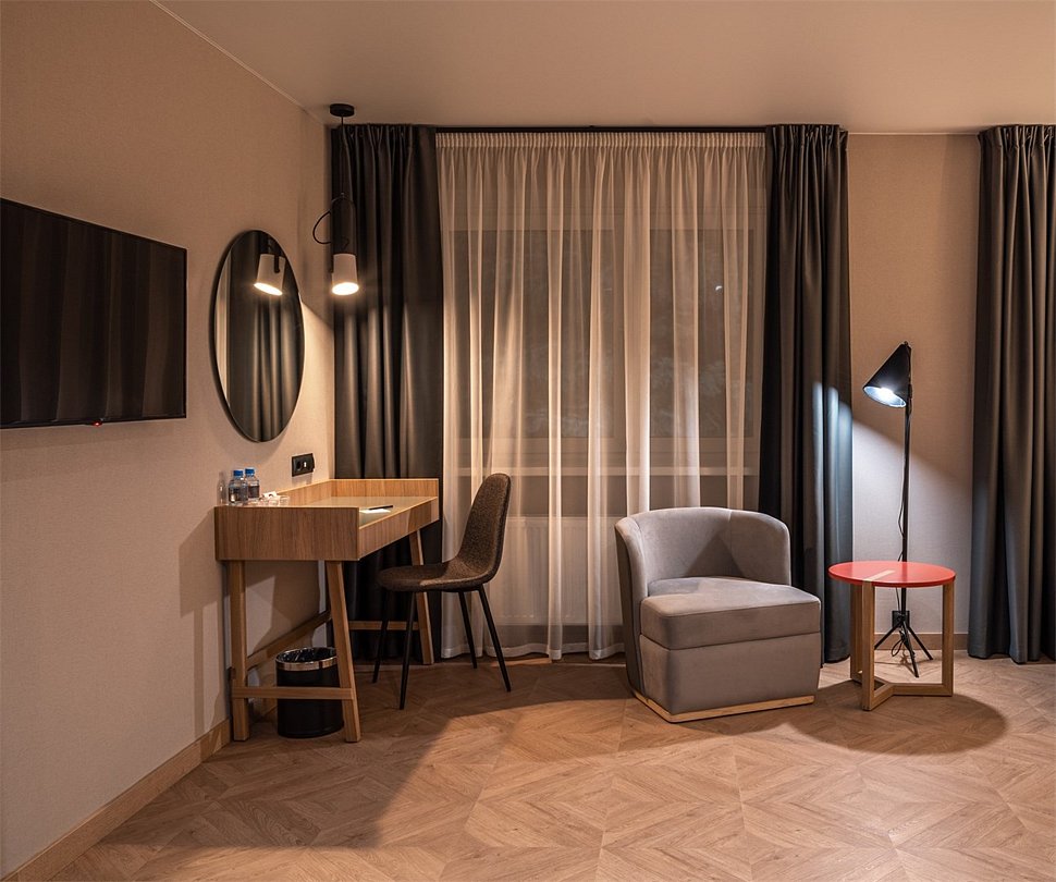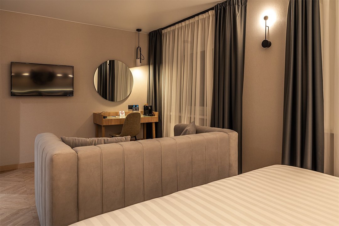 Просторный номер площадью 40 кв.м с большой двуспальной кроватью с ортопедическим эффектом, зоной отдыха с телевизором, диваном и журнальным столиком, кондиционером, сейфом и телефоном для внутренней связи в отеле. Также в номере есть Wi-Fi, бутилированная вода, чайная станция, мини-холодильник, ванная комната, фен, косметические принадлежности, тапочки, полотенца, гладильные принадлежностиУслуги и удобства