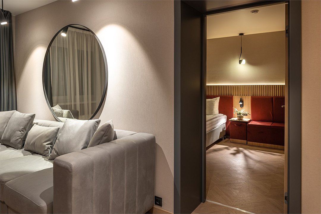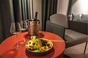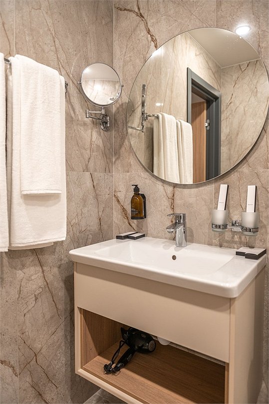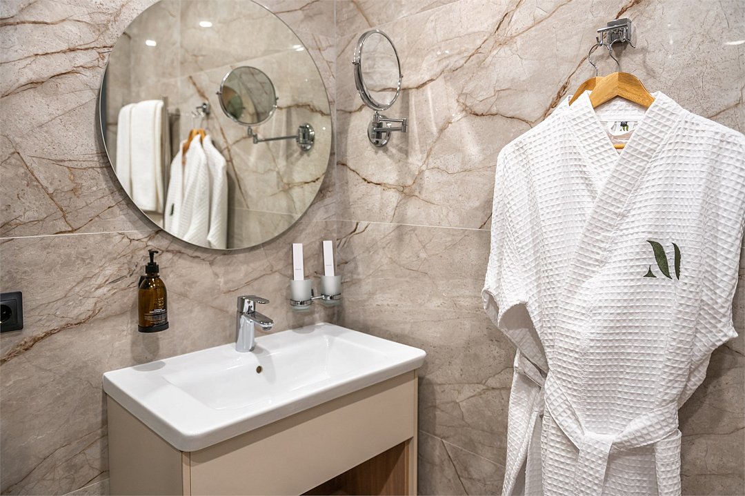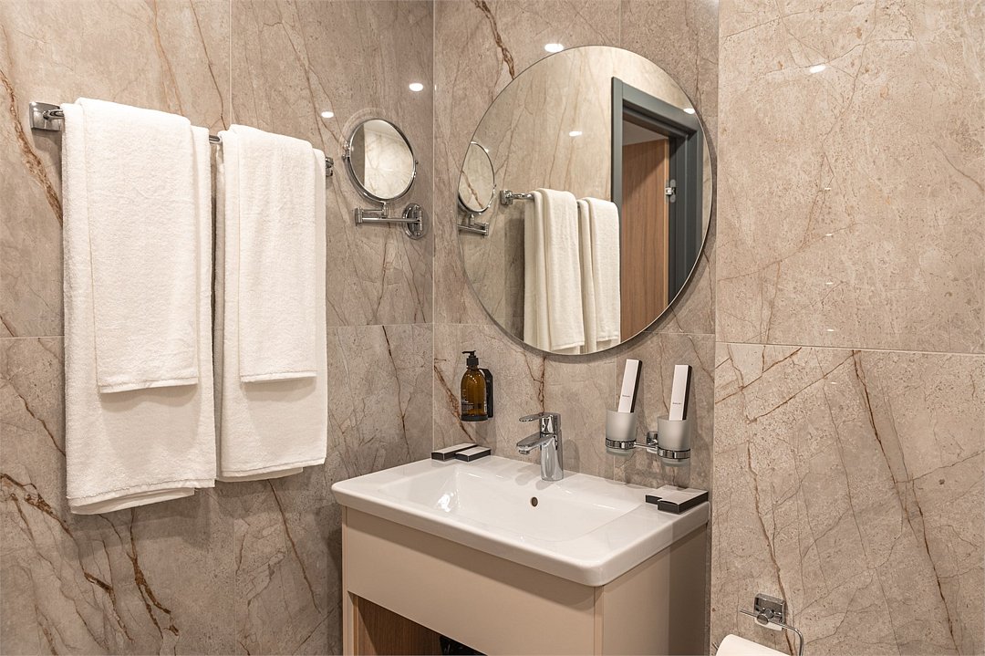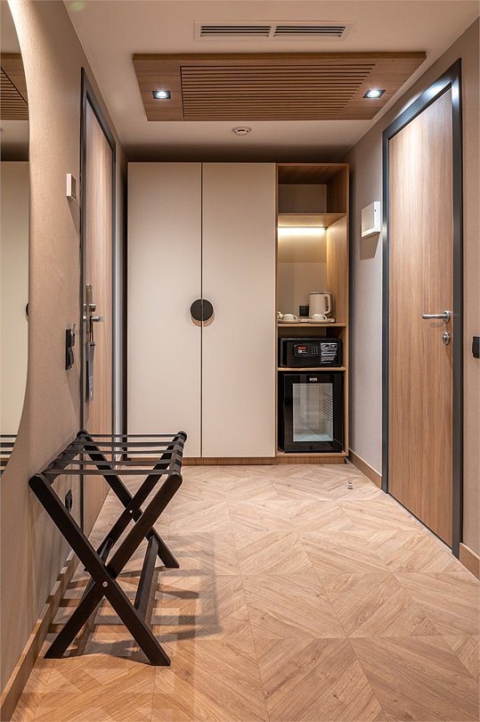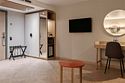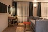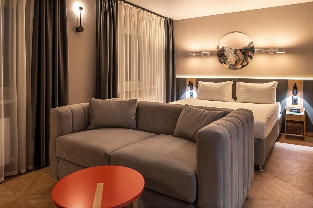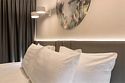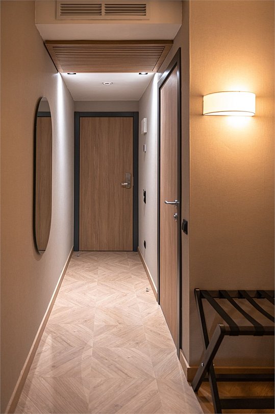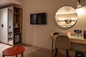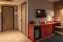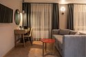 Просторный номер площадью 40 кв.м с большой двуспальной кроватью с ортопедическим эффектом, зоной отдыха с телевизором, диваном и журнальным столиком, кондиционером, сейфом и телефоном для внутренней связи в отеле. Также в номере есть Wi-Fi, бутилированная вода, чайная станция, мини-холодильник, ванная комната, фен, косметические принадлежности, тапочки, полотенца, гладильные принадлежностиУслуги и удобства