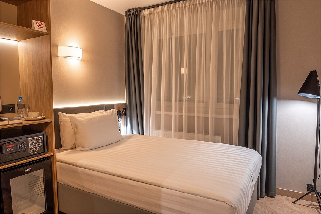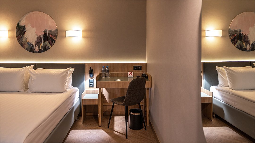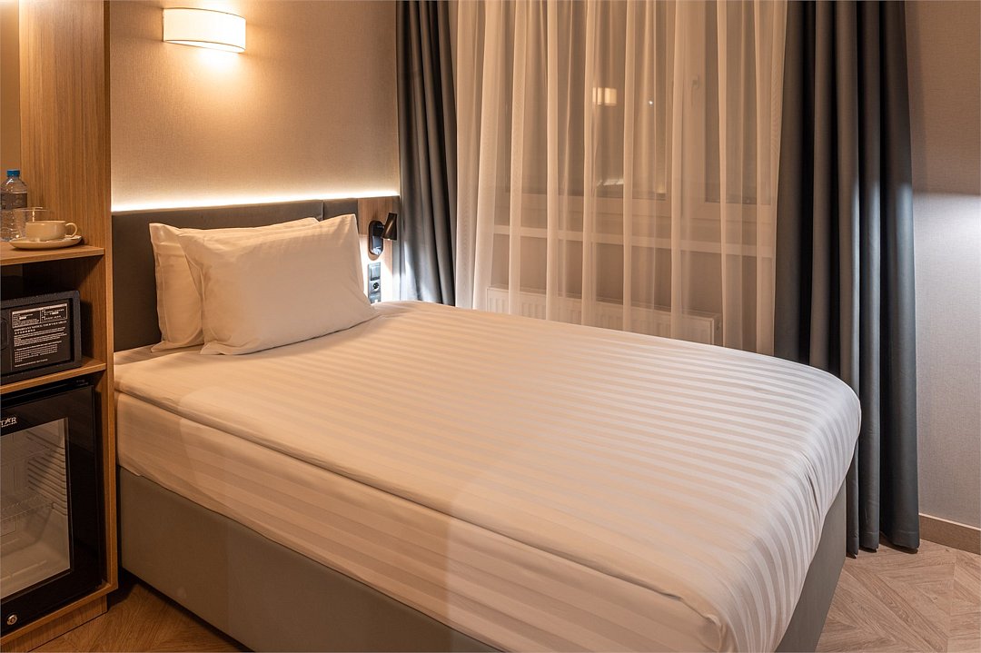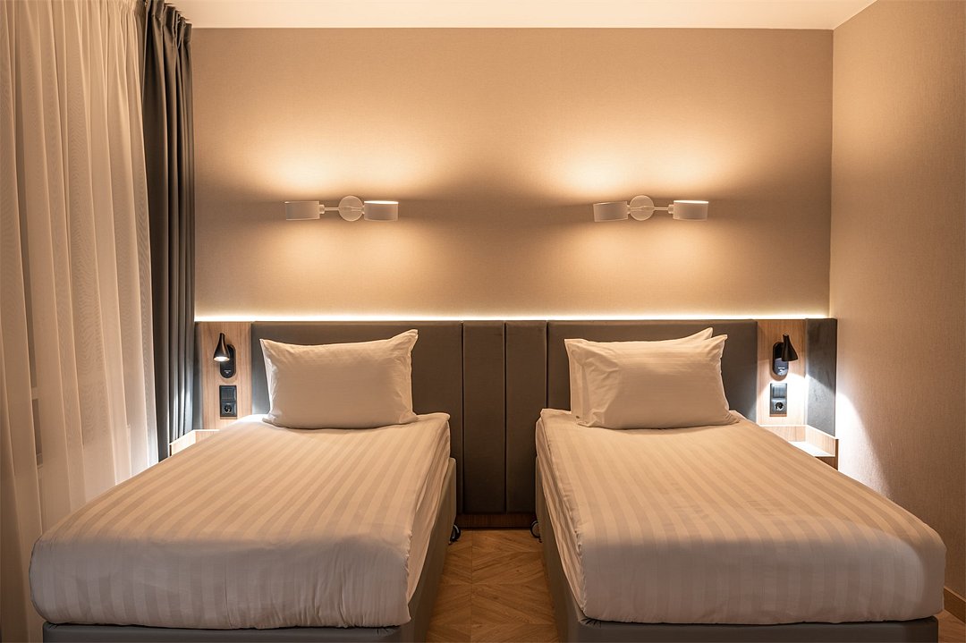 Уютный номер площадью 20 кв.м с двумя кроватями (90х200 см) с ортопедическим эффектом, (есть возможность соединить кровати- необходимо обратиться к менеджеру) Телевизор с плоским экраном, кондиционер, сейф, телефон для внутренней связи в отеле, Wi-Fi, вода, чайный набор, мини-холодильник, ванная комната с душем, фен, косметические принадлежности, тапочки, полотенца, гладильные принадлежностиУслуги и удобства