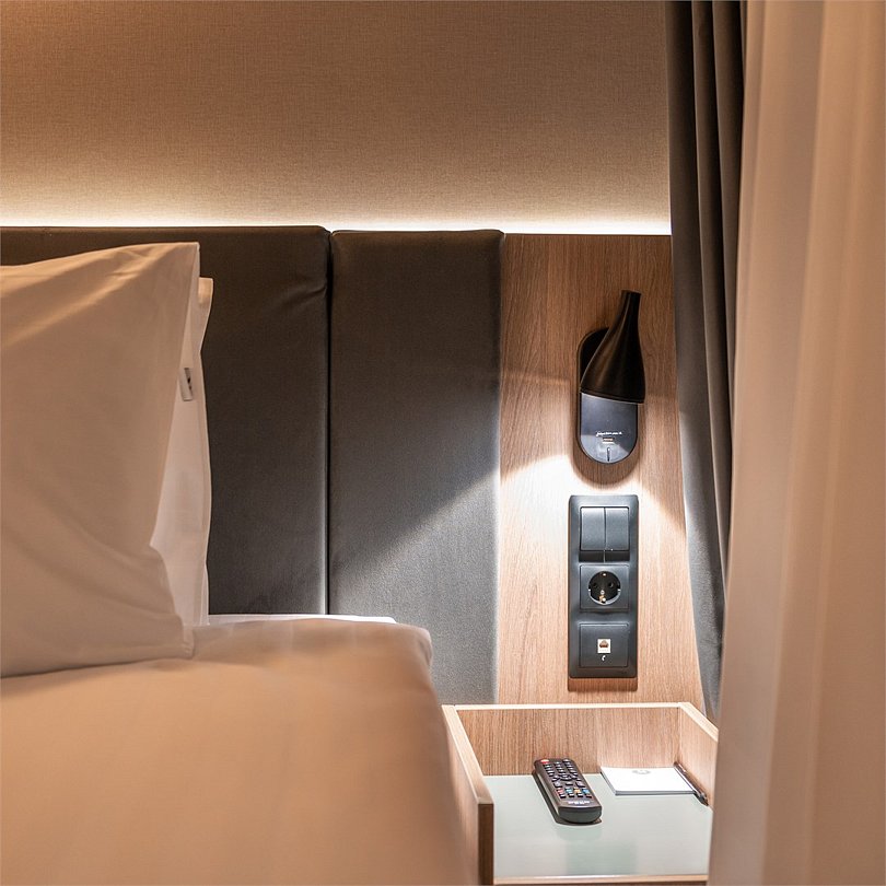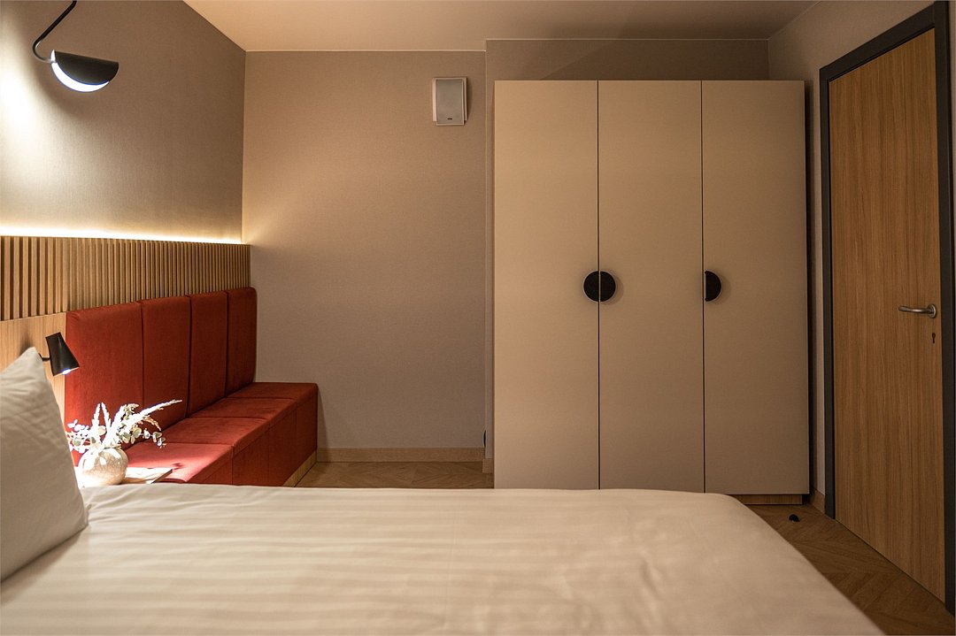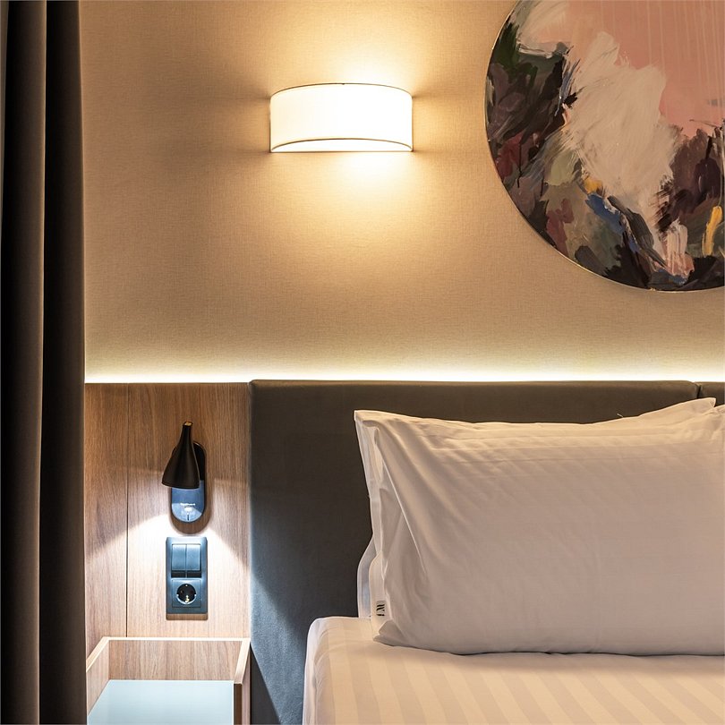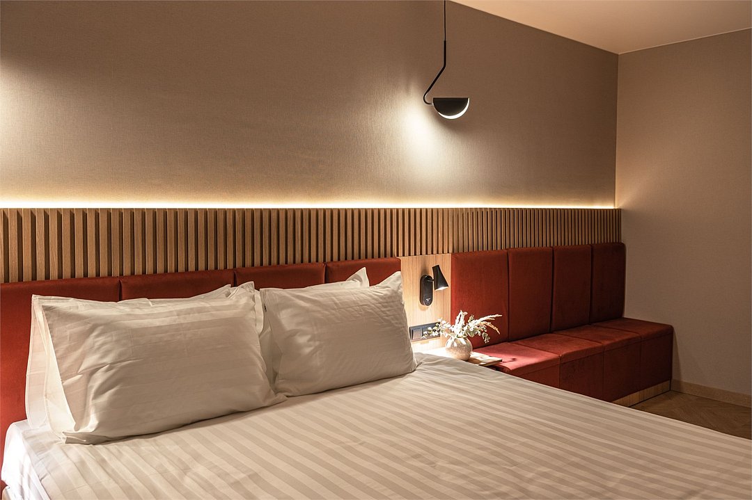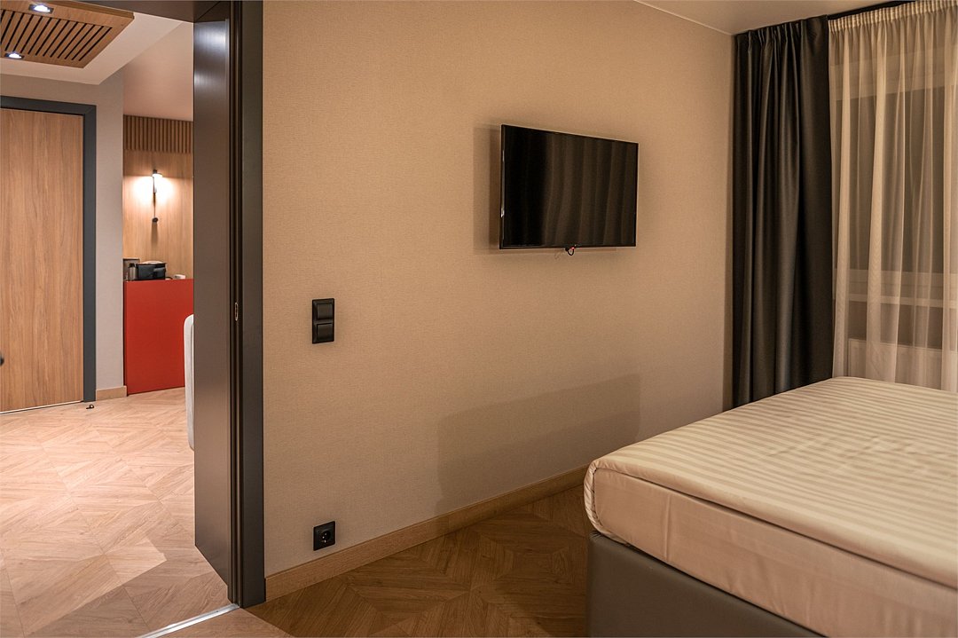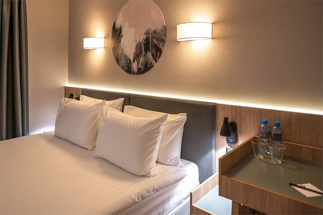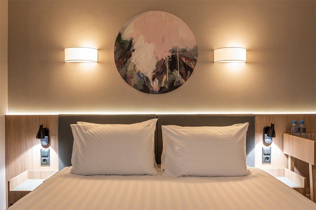 Уютный номер площадью 20 кв.м с двуспальной кроватью (160х200 см) с ортопедическим эффектом, телевизор с плоским экраном, кондиционер, сейф, телефон для внутренней связи в отеле, Wi-Fi, вода, чайный набор, мини-холодильник, ванная комната с душем, фен, косметические принадлежности, тапочки, полотенца, гладильные принадлежностиУслуги и удобства