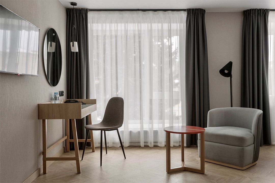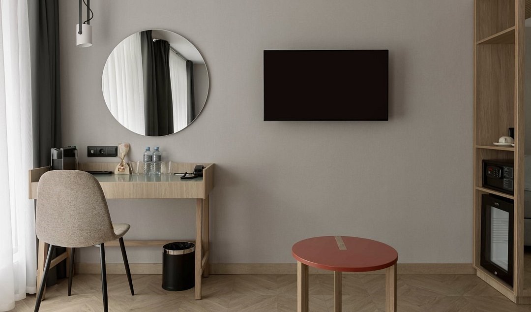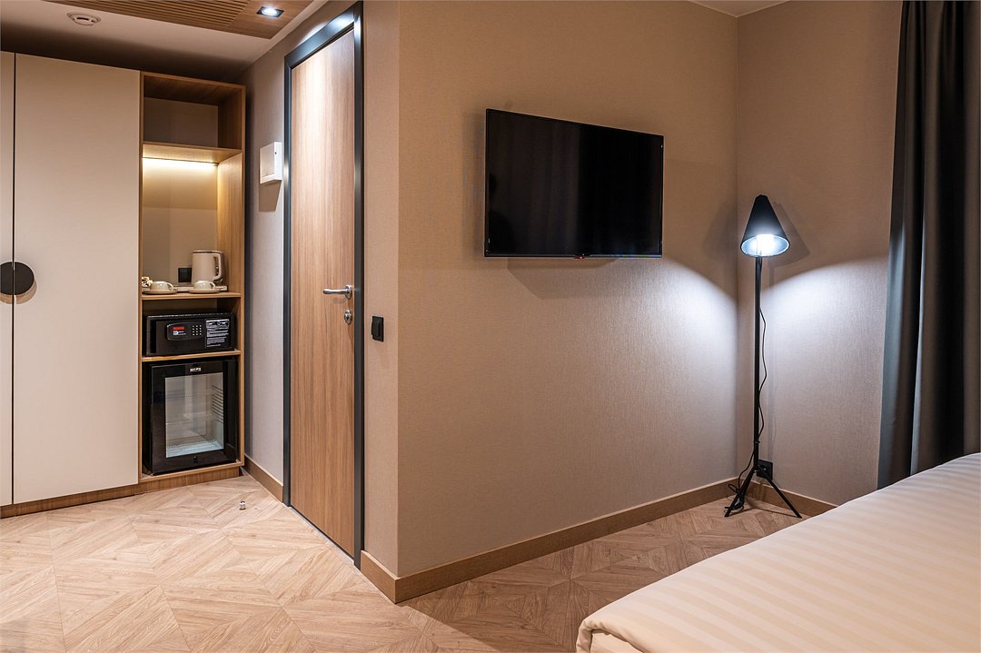 телевизор, Wi-Fi, телефон, кондиционер, светильник, фен, утюг, ванная комната, банные принадлежности, халаты, тапочки, косметические средства, двуспальная кровать, гладильная доска, кресла, шкаф для одежды, вешалки, журнальный столик, зеркало, набор посуды, сейф, чайник, унитаз, раковина, питьевая вода, отопление, душ, вид на город, кресло, паркет, стаканы, туалет, цифровое тв, мини-холодильник, москитная сетка, шкаф-купе, номер для некурящих, рабочий стол, чайная станция, умная колонка, набор для приготовления чая и кофе, мыло, затемняющая штора, можно с питомцамиВ гостиничном номере