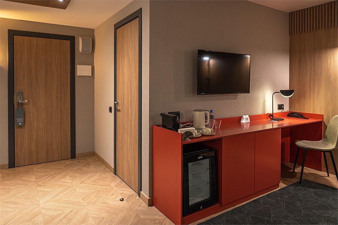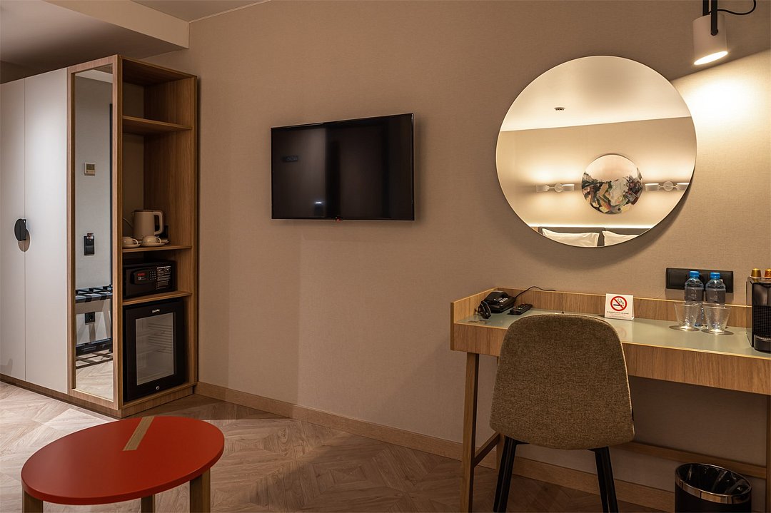телевизор, Wi-Fi, кондиционер, светильник, настольные лампы, фен, электронные замки, утюг, ванная комната, халаты, банные полотенца, тапочки, косметические средства, двуспальная кровать, гладильная доска, тумбы, шкаф для одежды, вешалки, журнальный столик, письменный стол, зеркало, мини-бар, чайный набор, обслуживание номеров, сейф, чайник, унитаз, раковина, мягкая мебель, питьевая вода, гостиная зона, отопление, душ, вид на город, кресло, паркет, стаканы, стул, цифровое тв, раскладной диван, внутренний телефон, мини-холодильник, москитная сетка, номер для некурящих, рабочий стол, чайная станция, уборка номера, набор для приготовления чая и кофе, затемняющая штора, можно с питомцамиВ гостиничном номере