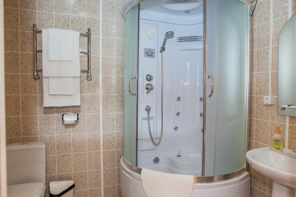 Просторный трехместный номер класса люкс. Гости располагаются на большой двуспальной и одной полутороспальной кровати. В номере так же есть большой шкаф для одежды, телевизор, прикроватная мебель, холодильник и электрочайник. В ванной находятся все необходимые принадлежности, фен, а так же установлена душевая кабина.