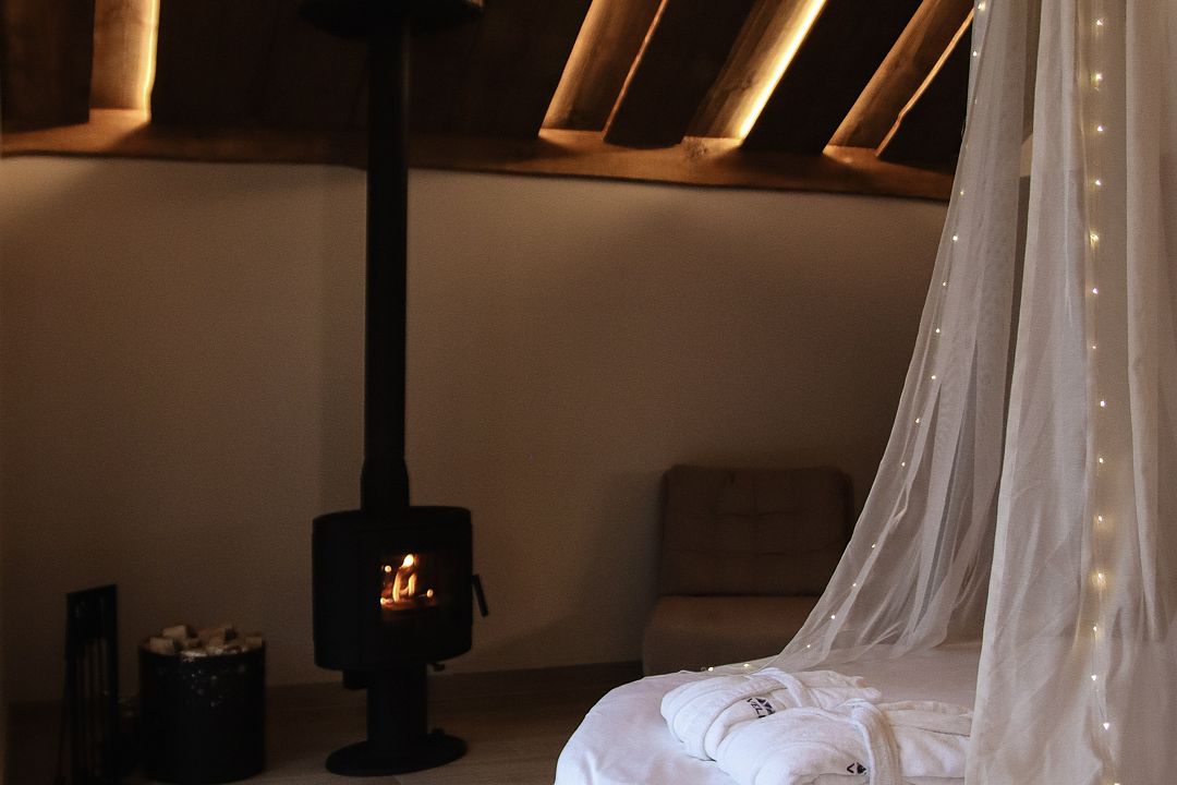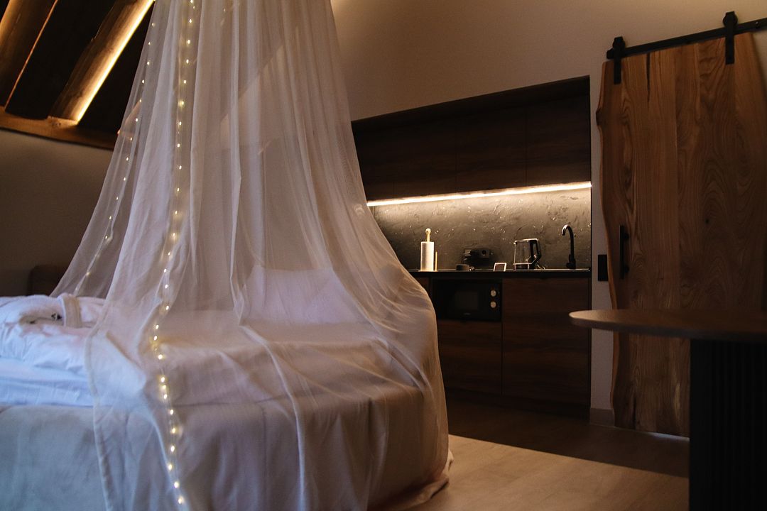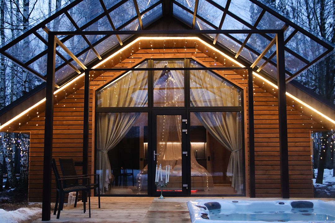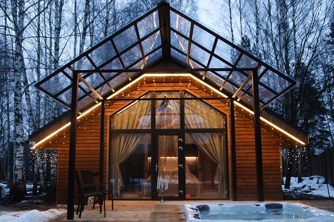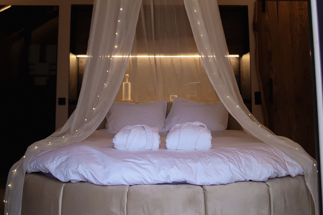 Расположенный в живописной местности, дом «Стихия Любви» предлагает комфортное проживание в окружении леса и чистого воздуха. Пространство домика продумано до мельчайших деталей: уютная спальня с большой круглой кроватью и воздушным балдахином, современная кухня с необходимой техникой и гостиная с камином, где можно уютно устроиться вечером.
