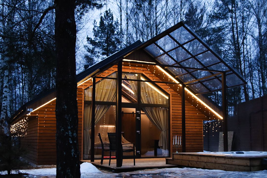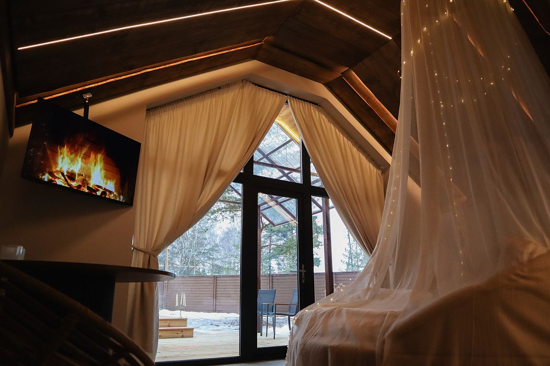 Дом с двумя спальнями и гостиной, панорамным окном и камином. Умиротворяющая атмосфера, гармония и покой. Для ценителей тишины, природы и личного пространства.