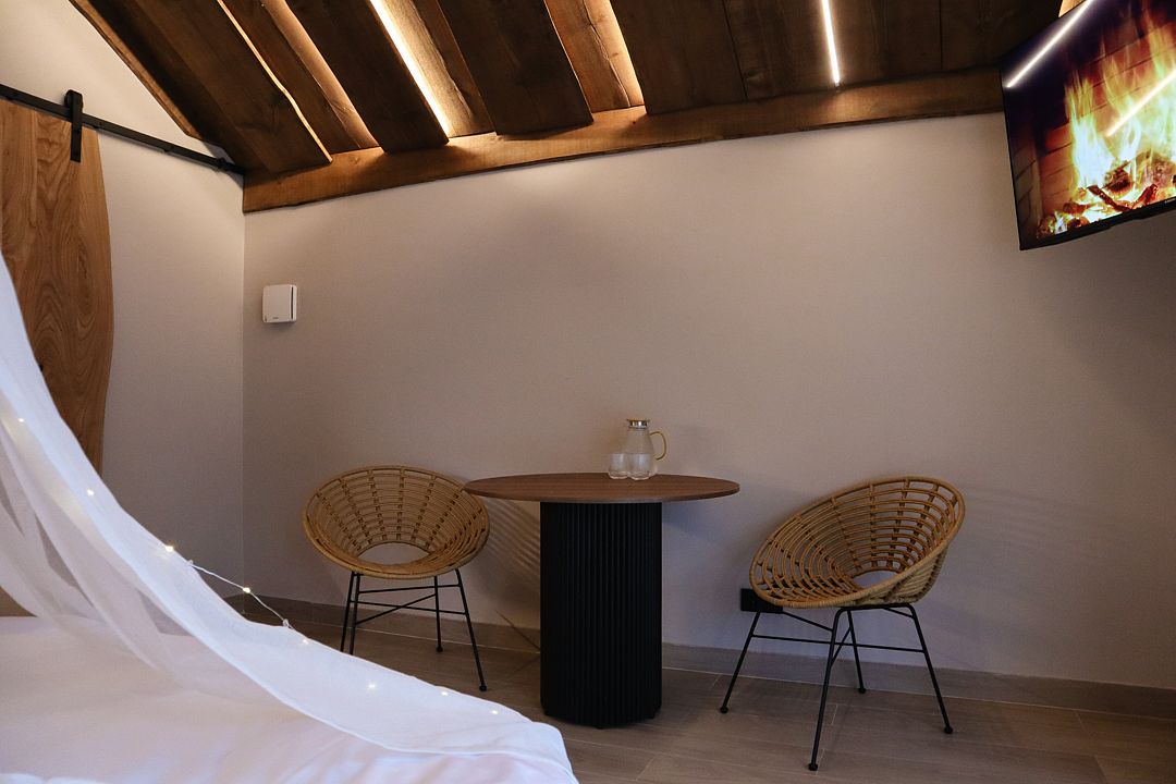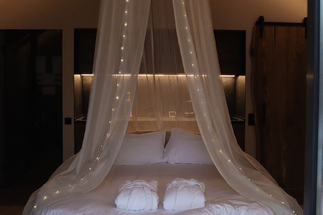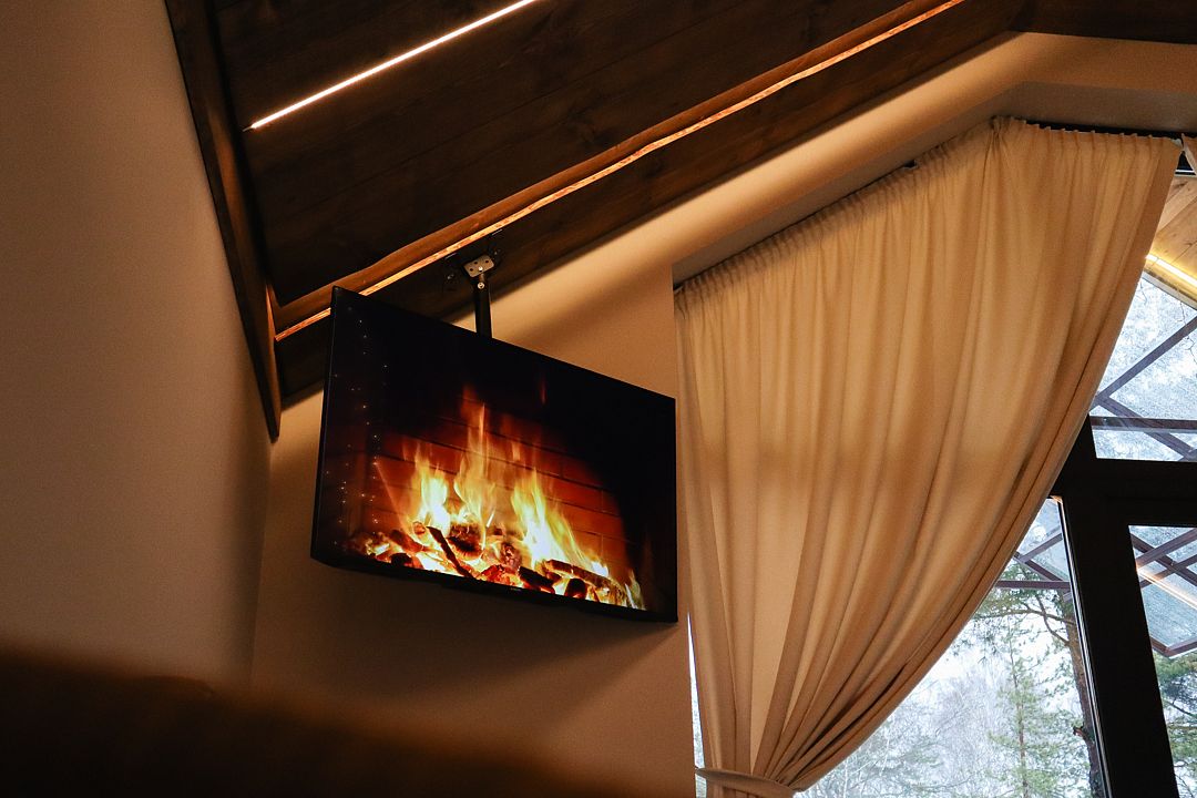 Дизайнерские решения каждого дома отражают характерные элементы Стихии, создавая неповторимый антураж. Уютные кровати с ортопедическими матрасами и белоснежным постельным бельем обеспечивают комфортный сон на природе. Обустроенная ванная комната сохраняет привычный комфорт во время отдыха. Для связи с миром и развлечений имеется телевизор и Wi-Fi. А камин создаст уютную атмосферу прохладными вечерами.