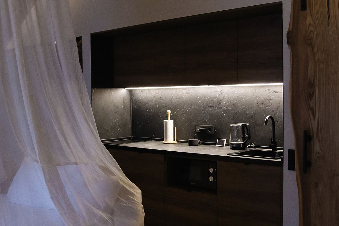 Кухня, оборудованная всем необходимым для самостоятельной готовки, даст возможность не изменять своим предпочтениям в еде. Также есть возможность заказать вкусные завтраки из ресторана.