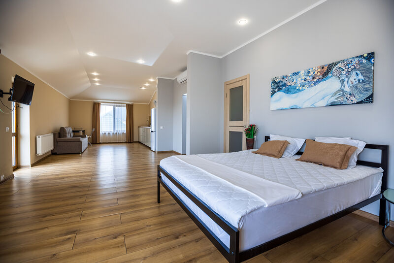 Кровать двуспальная, диван-кровать, зеркало, прикроватные тумбы, телевизор, санузел (душ+туалет), КУХНЯ, чайник, микроволновая печь, обеденный стол, стулья, балкон, гардеробная