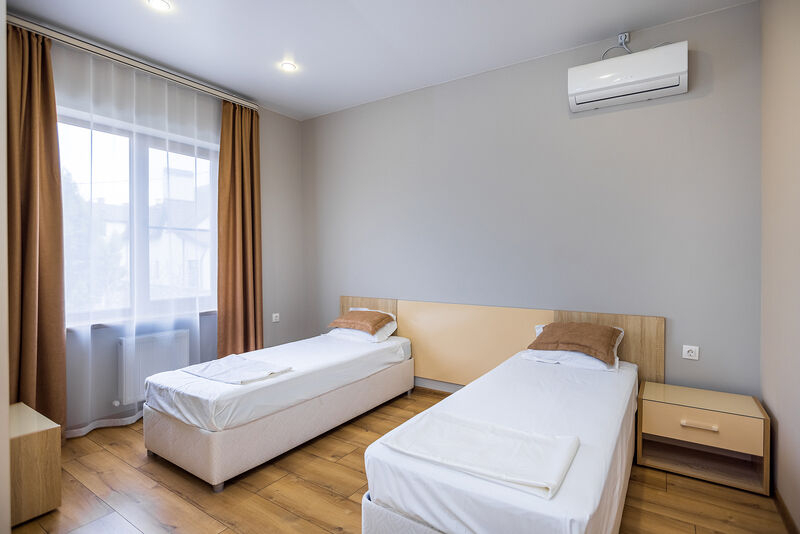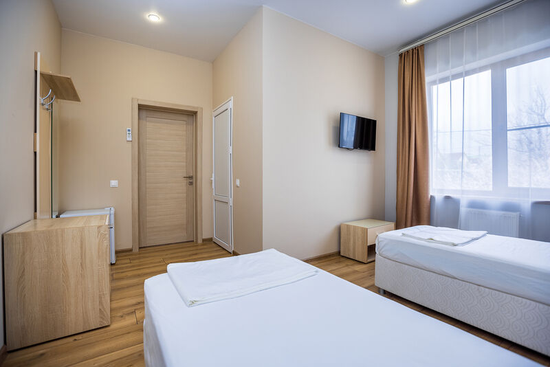Две раздельные кровати, зеркало, прикроватные тумбы, телевизор, санузел(душ+туалет), общая кухня
