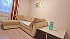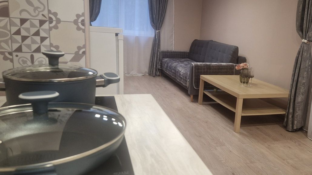 Просторная двуспальная кровать с ортопедическим матрасом, удобные кресла и столик у панорамного окна, дополнительная кровать на втором ярусе, а также полностью оборудованная кухонная зона (микроволновка, чайник, вся необходимая посуда).