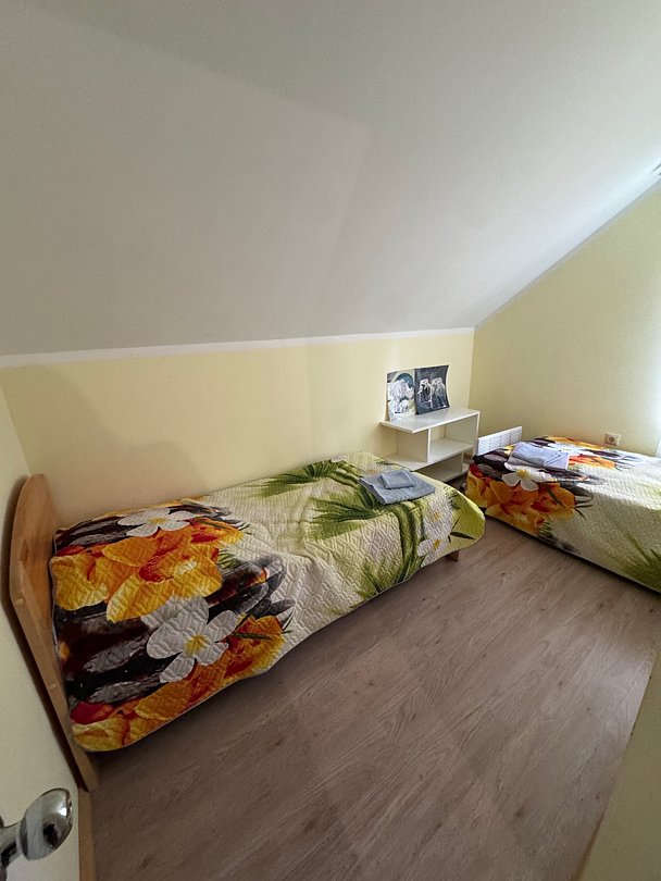В доме две изолированные спальни на втором этаже и большая кухня-гостиная на первом этаже. На обоих этажах санузлы с душевыми.
