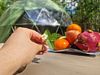 В санузле душевая кабина, унитаз и умывальник. На террасе — мангал для приготовления блюд на углях и уличная мебель.