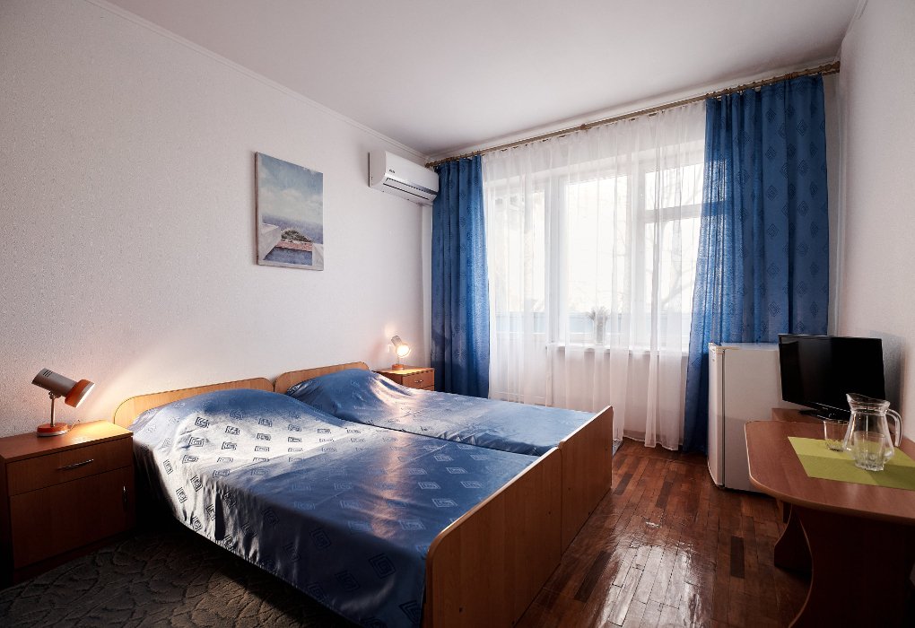 Однокомнатный или двухкомнатный номер. В цену включено трехразовое питание - шведский стол! Номера на 2 или 3 основных места. Площадь номера - от 14 до 20 кв.м. Основные места - две или три односпальные кровати, либо двуспальная кровать и одна односпальная кровать. Номера данной категории располагаются на 1-4 этажах. Вид с верхних этажей - на море. Вид с первых этажей на сад. Дополнительное место-раскладушка возможно установить только в двухкомнатном номере.Услуги и удобства