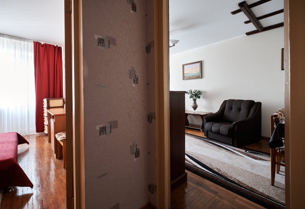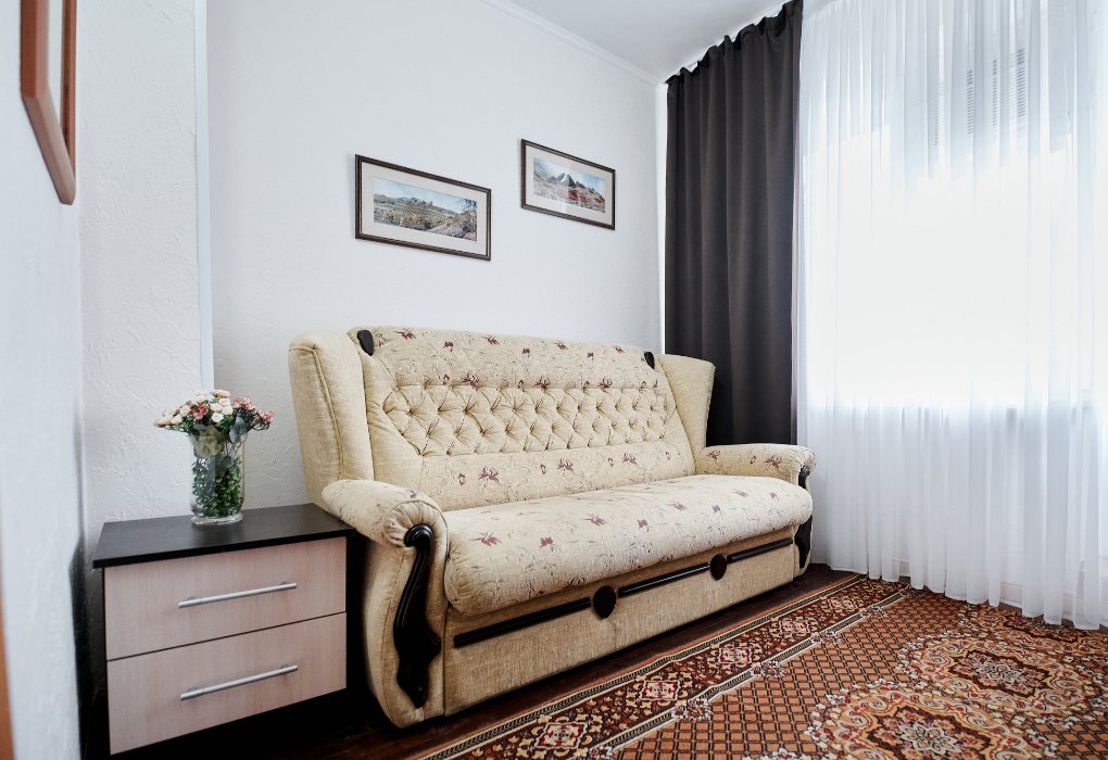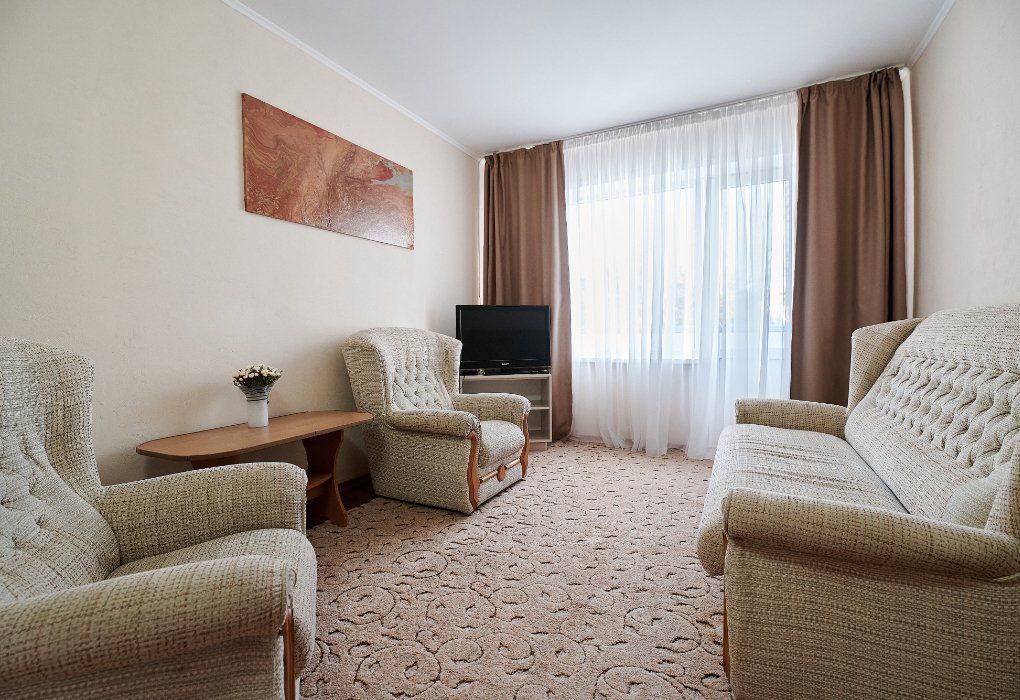 Двухкомнатный или трёхкомнатный номер. В цену включено трехразовое питание - шведский стол! Номера на 3 основных места и 1 дополнительное (евро раскладушка). Площадь номера - от 34 кв.м. Основные и дополнительные места - двуспальная кровать (не раздвигается), диван. Дополнительное место - совместный диван или евро раскладушка. Номера данной категории располагаются на 1-4 этажах. Вид с верхних этажей на прилегающую парковую территорию и детскую площадку. Вид с первых этажей на сад.Услуги и удобства