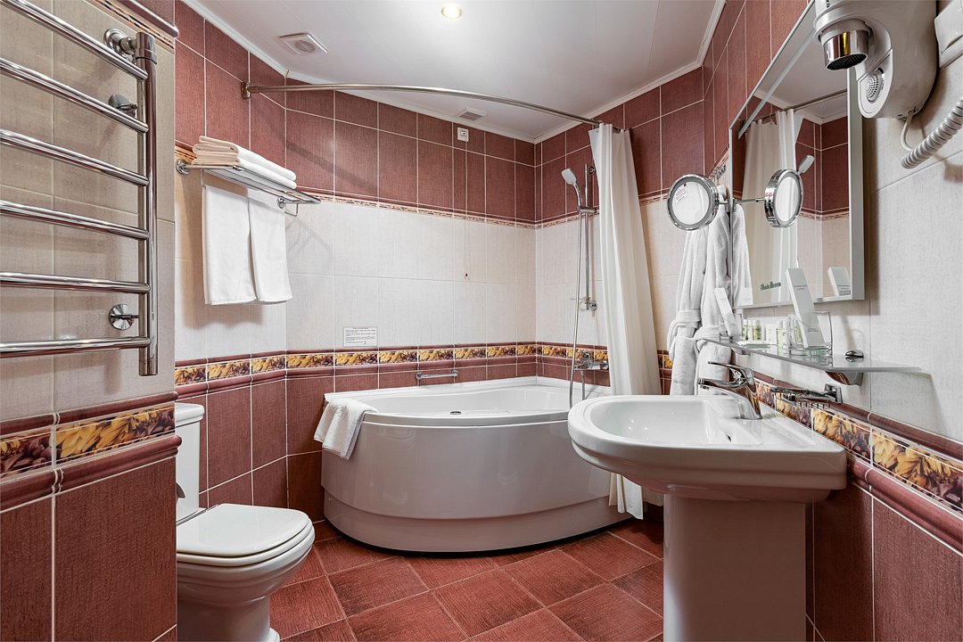 телевизор, кабельное телевидение, Wi-Fi, интернет, телефон, система климат-контроля, светильник, настольные лампы, фен, электронные замки, ванная комната, ванна, халаты, банные полотенца, тапочки, косметические средства, кровать «King size», кресла, тумбы, стулья, шкаф для одежды, вешалки, журнальный столик, письменный стол, багажная тумба, зеркало, сейф, унитаз, раковина, гостиная зона, ковровое покрытие, отопление, вид на город, вид во двор, мини-холодильникВ номере