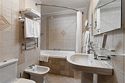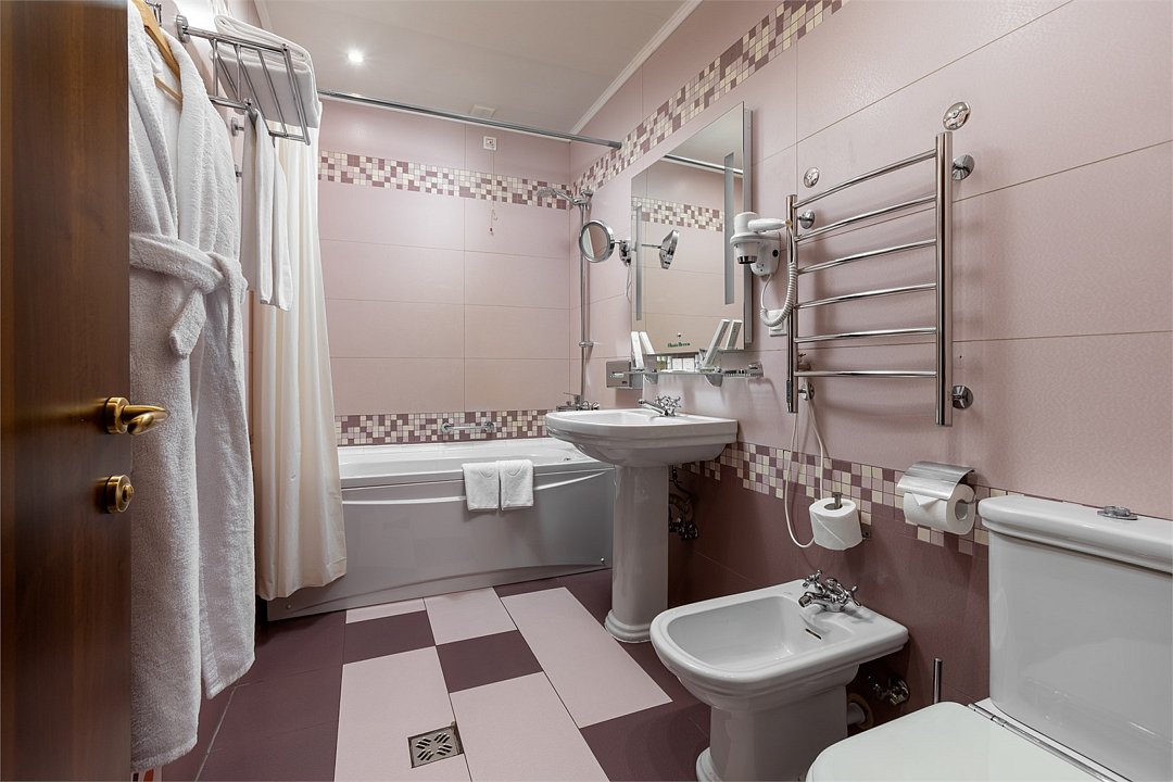 телевизор, кабельное телевидение, Wi-Fi, интернет, телефон, система климат-контроля, светильник, настольные лампы, фен, электронные замки, ванная комната, гидромассажная ванна, биде, халаты, банные полотенца, тапочки, косметические средства, кровать «King size», кресла, тумбы, стулья, шкаф для одежды, журнальный столик, письменный стол, стол для переговоров, багажная тумба, зеркало, сейф, унитаз, раковина, косметическое зеркало, гостиная зона, ковровое покрытие, отопление, вид на город, мини-холодильникВ номере