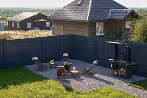 Открытая терраса с качелями становится идеальным местом для наслаждения утренним кофе или вечерними беседами на свежем воздухе, позволяя забыть о времени и погрузиться в звуки природы. Уютная костровая зона с удобными шезлонгами приглашает проводить вечера, радуясь теплу огня и разговорами с близкими под звездным небом. А мангал, расположенный поблизости, преобразит ваши трапезы в настоящие праздники вкуса, полные удовольствия и веселья.