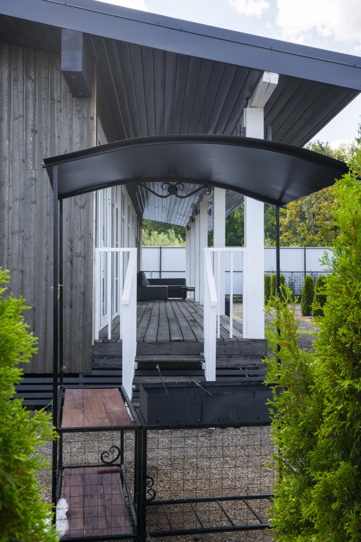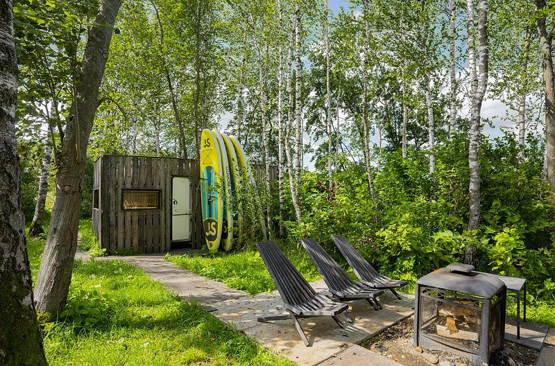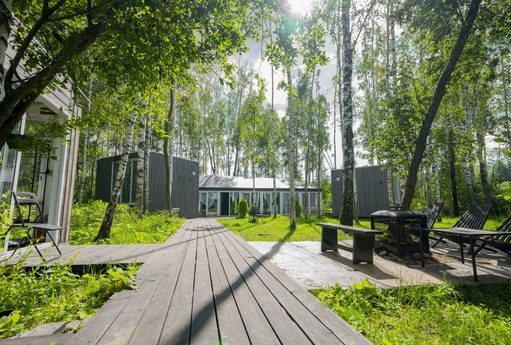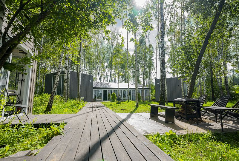 Рядом с домиками зона для барбекю с мангалом и костровая чаша.