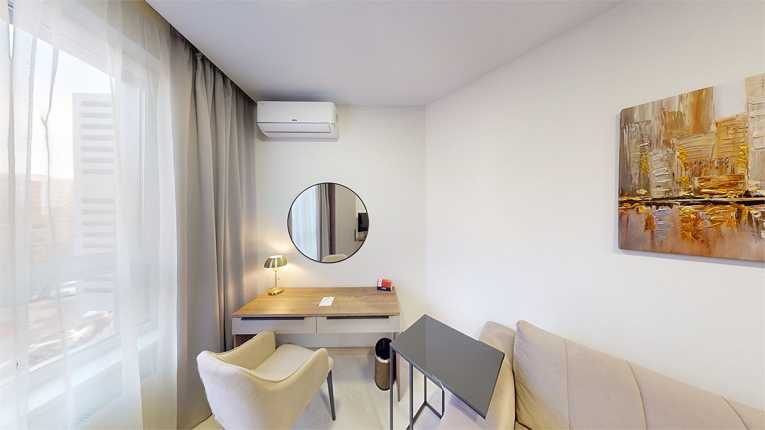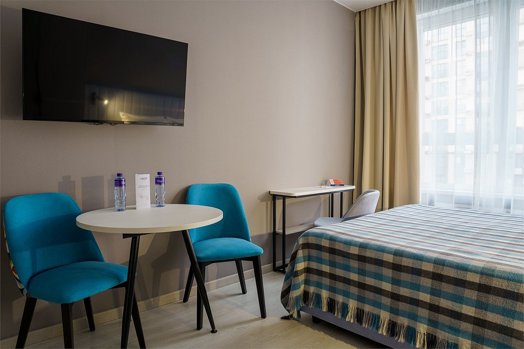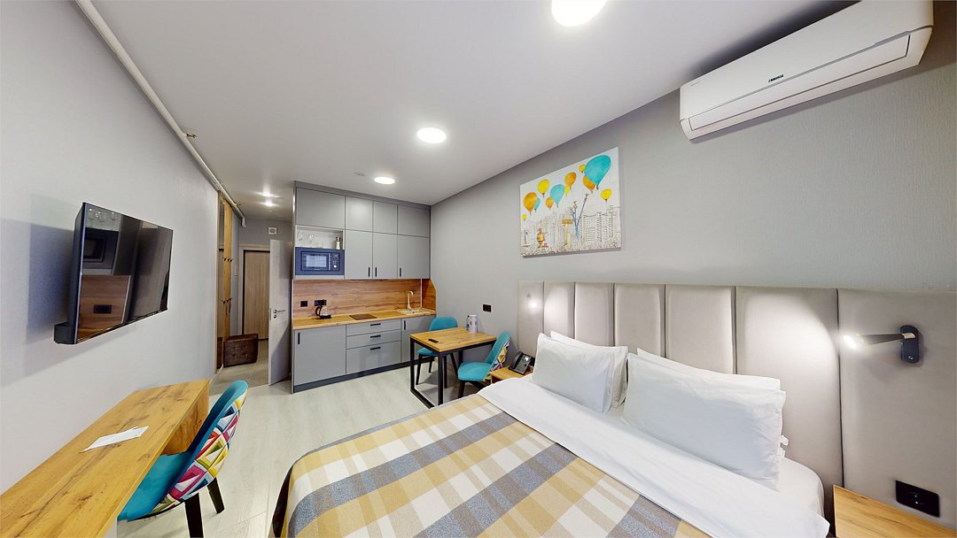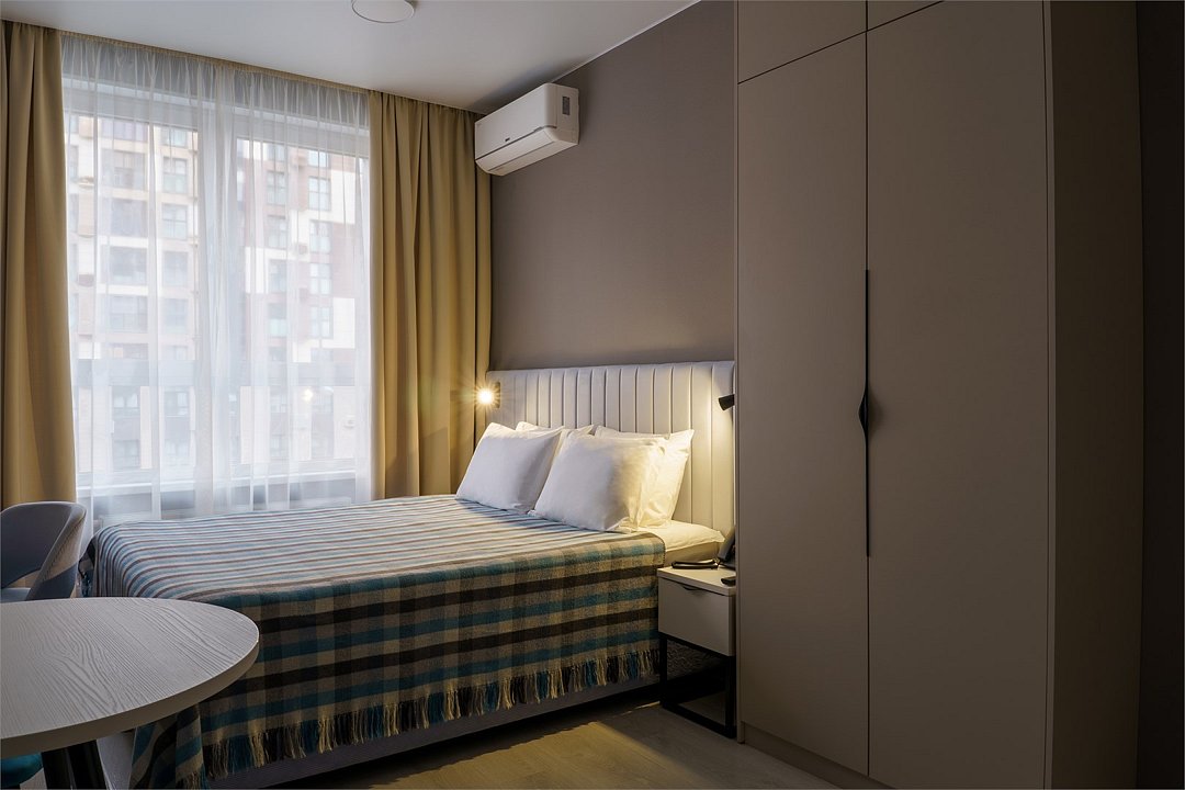 Номера категории Стандарт – это стильные и современные номера площадью от 23 кв.м. с лаконичным дизайном. Номер-студия с душевой кабиной, рабочей и кухонной зонами. Кухонная зона оснащена варочной панелью, вытяжкой, холодильником, духовым шкафом, чайником, стиральной машиной. Есть возможность забронировать номер с двуспальной кроватью или двумя раздельными.Услуги и удобства
