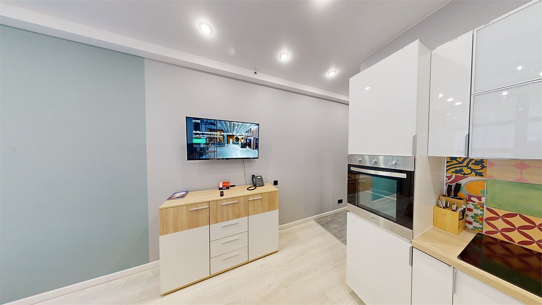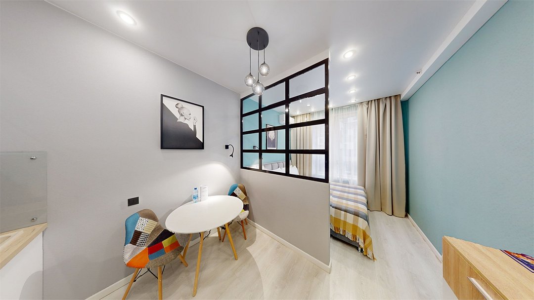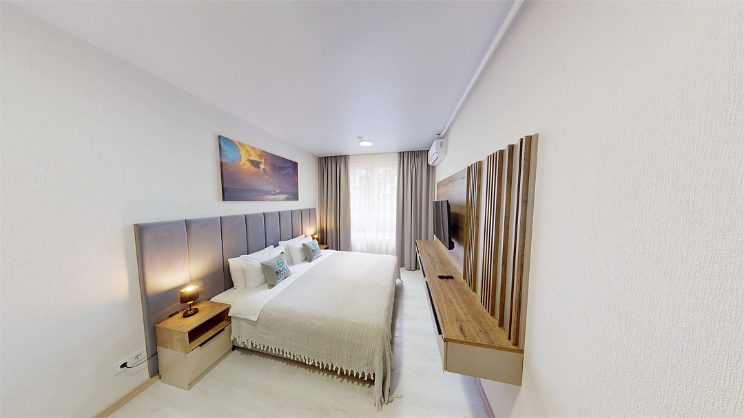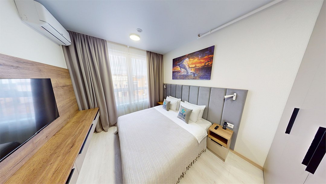 Номер категории Студия – это номер, площадью 23 кв.м., жилое пространство которого разделено на две зоны – кухню-гостиную и зону отдыха с двуспальным диваном. Просторный и светлый номер порадует даже самого разборчивого гостя. Номер оборудован всем необходимым для беззаботного и комфортного отдыха.Услуги и удобства