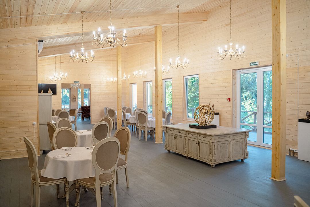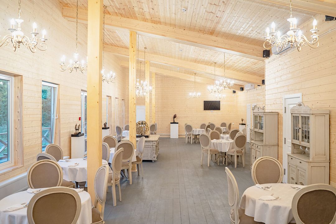 Площадь конференц зала 75м2. Светлый зал с панорамными окнами отделан деревом и отсюда открыватеся красивый вид на лес.