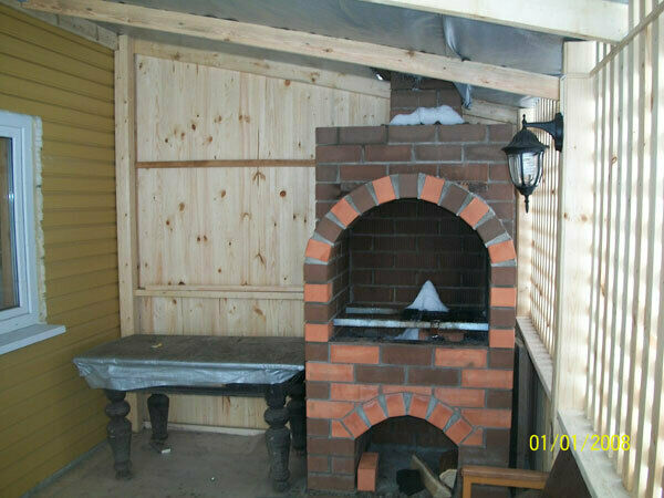 Дом с баней, тулет на улице, рядом с домом мангал, печь.
