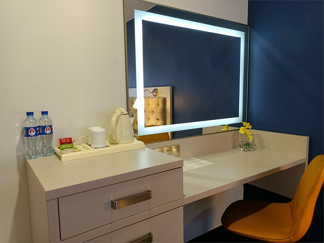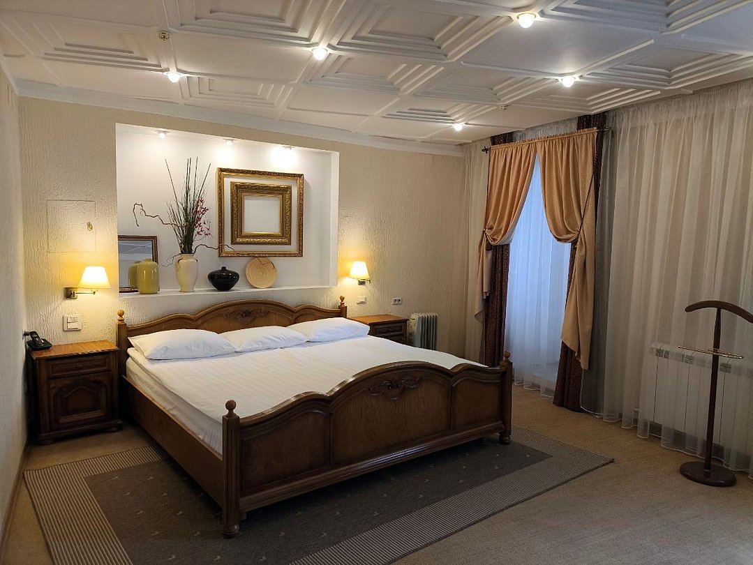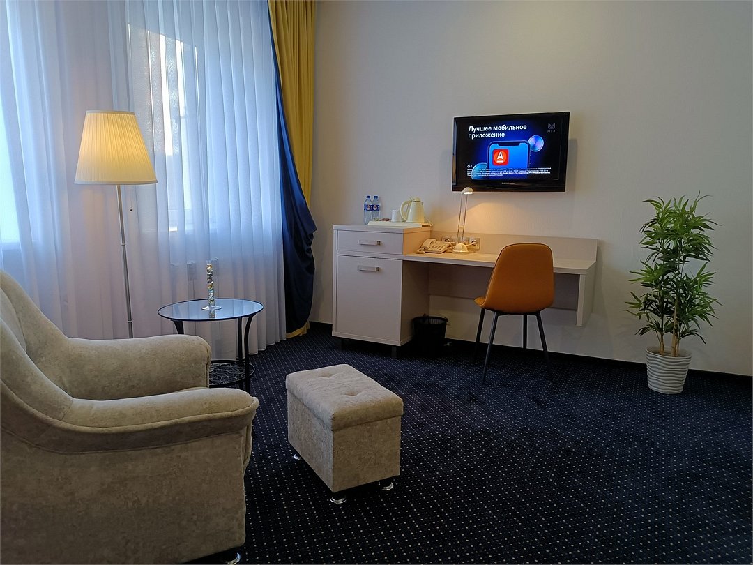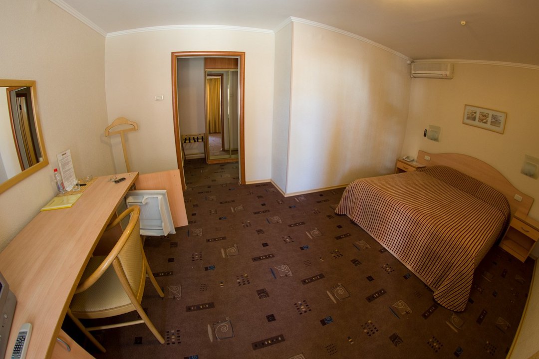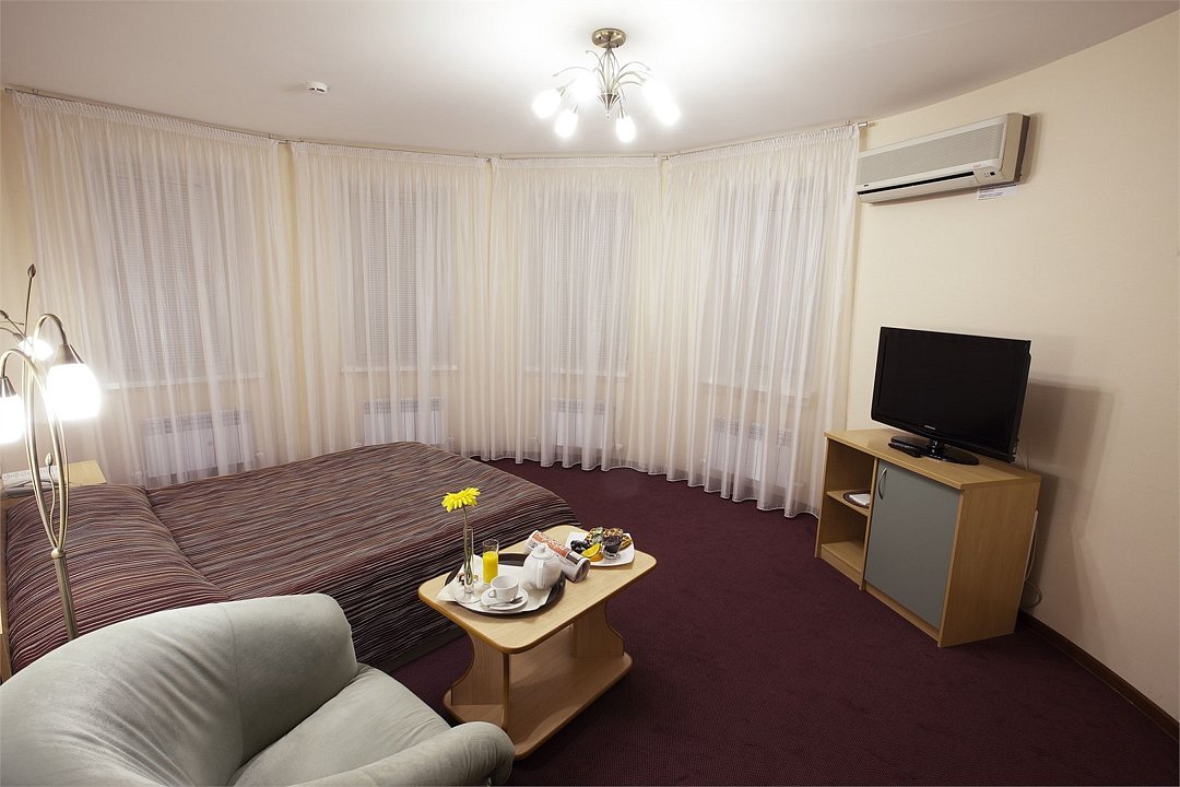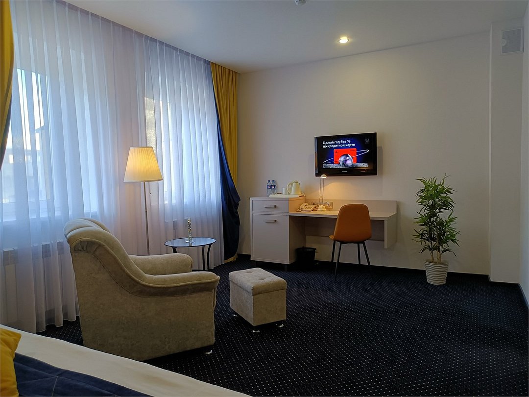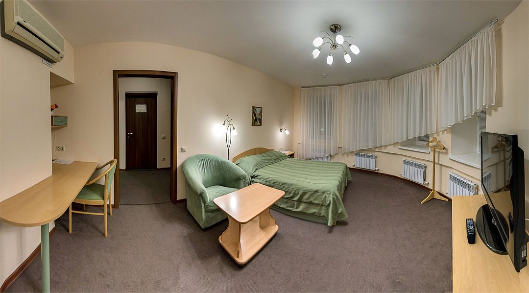 Просторный однокомнатный номер (30 кв.м.) с обновлённым дизайном. В номере есть всё необходимое для полноценной работы и отдыха: двуспальная кровать, телевизор, чайная станция, холодильник и кондиционер. В ванной комнате в наличии фен, шампунь, гель для душа, жидкое мыло, комплект полотенец, халат и тапочки. В стоимость проживания уже включен завтрак «шведский стол», беспроводной интернет и охраняемая парковка. Чай, сахар и бутилированная вода обновляются каждый день.Услуги и удобства
