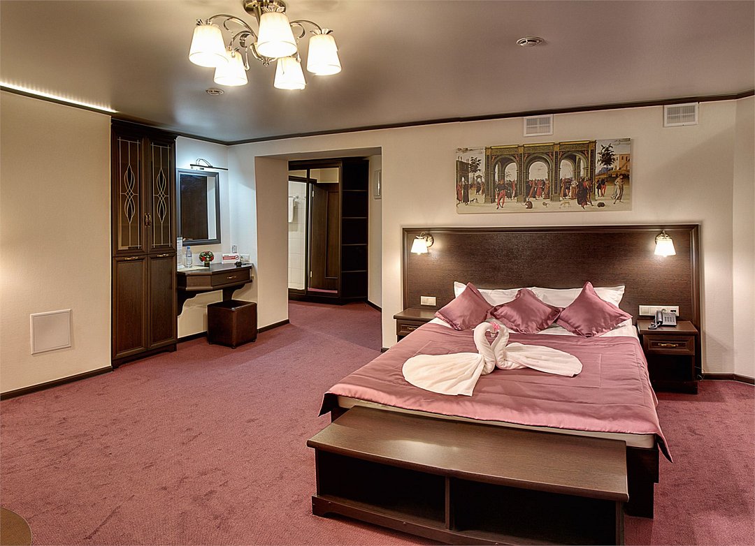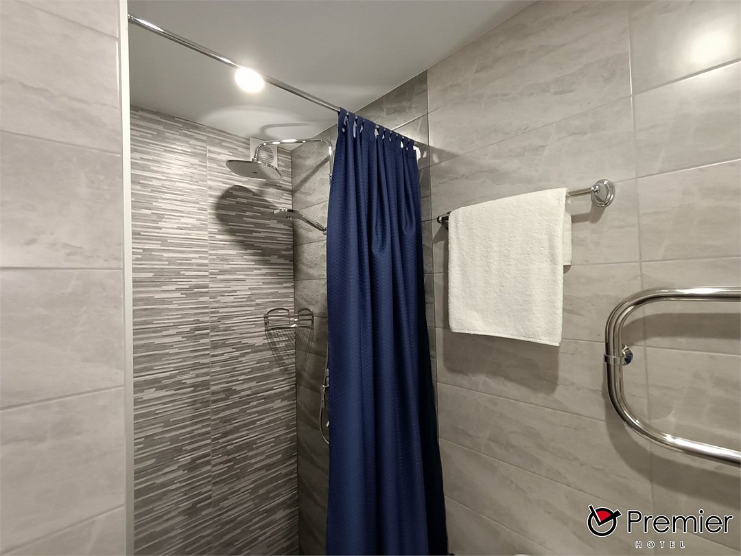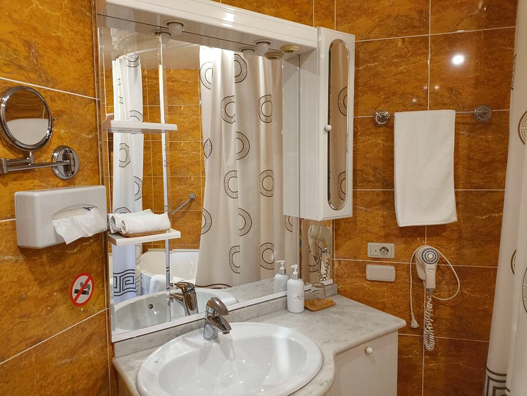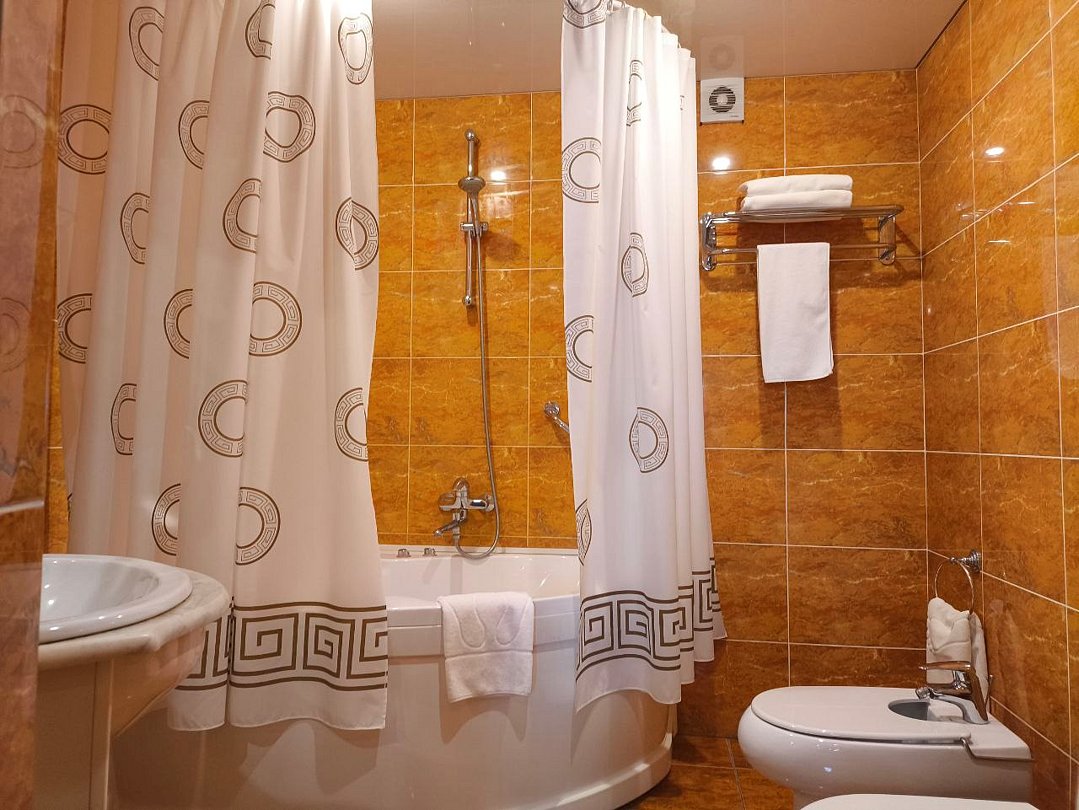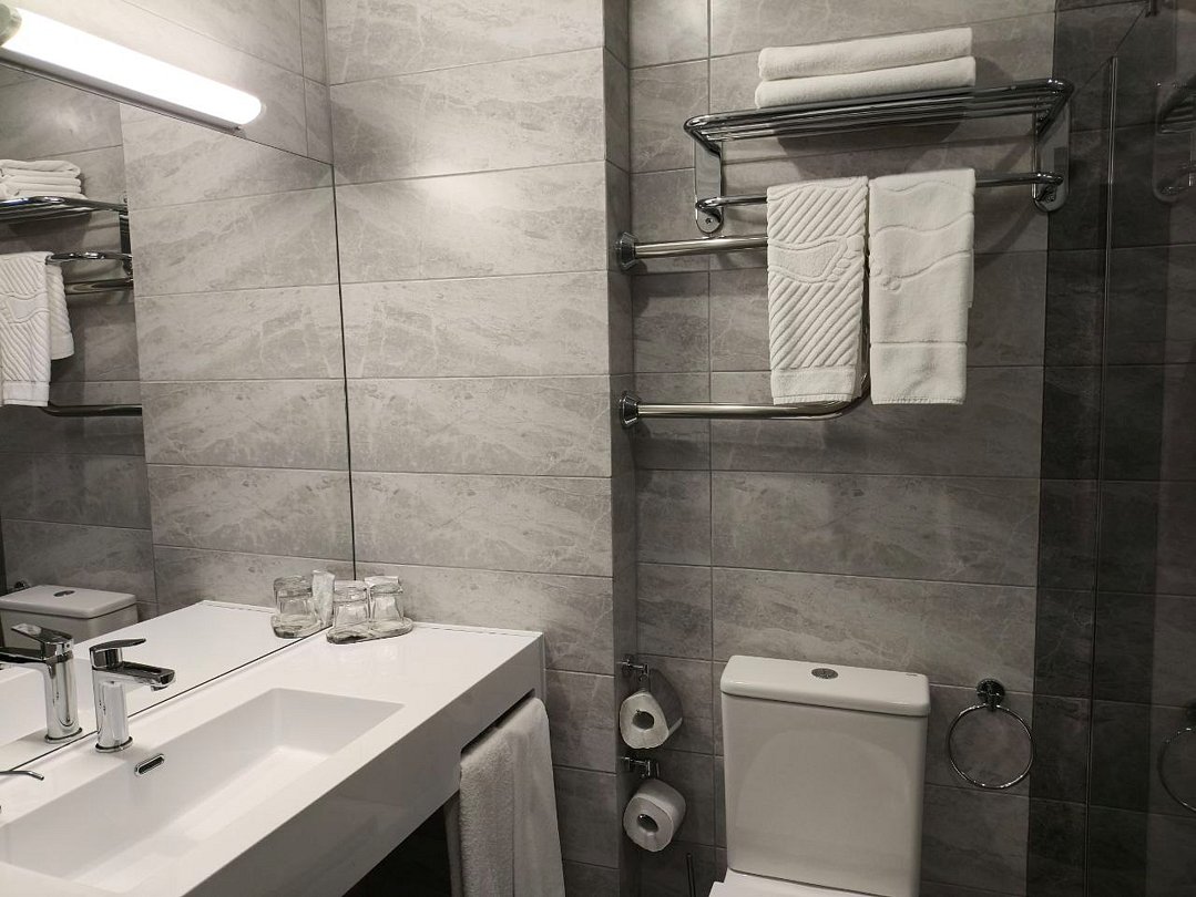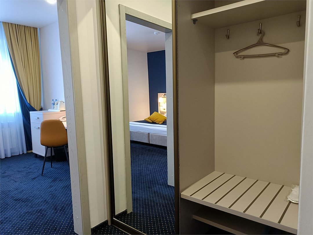 Просторный однокомнатный номер (30 кв.м.) с обновлённым дизайном. В номере есть всё необходимое для полноценной работы и отдыха: двуспальная кровать, телевизор, чайная станция, холодильник и кондиционер. В ванной комнате в наличии фен, шампунь, гель для душа, жидкое мыло, комплект полотенец, халат и тапочки. В стоимость проживания уже включен завтрак «шведский стол», беспроводной интернет и охраняемая парковка. Чай, сахар и бутилированная вода обновляются каждый день.Услуги и удобства