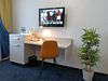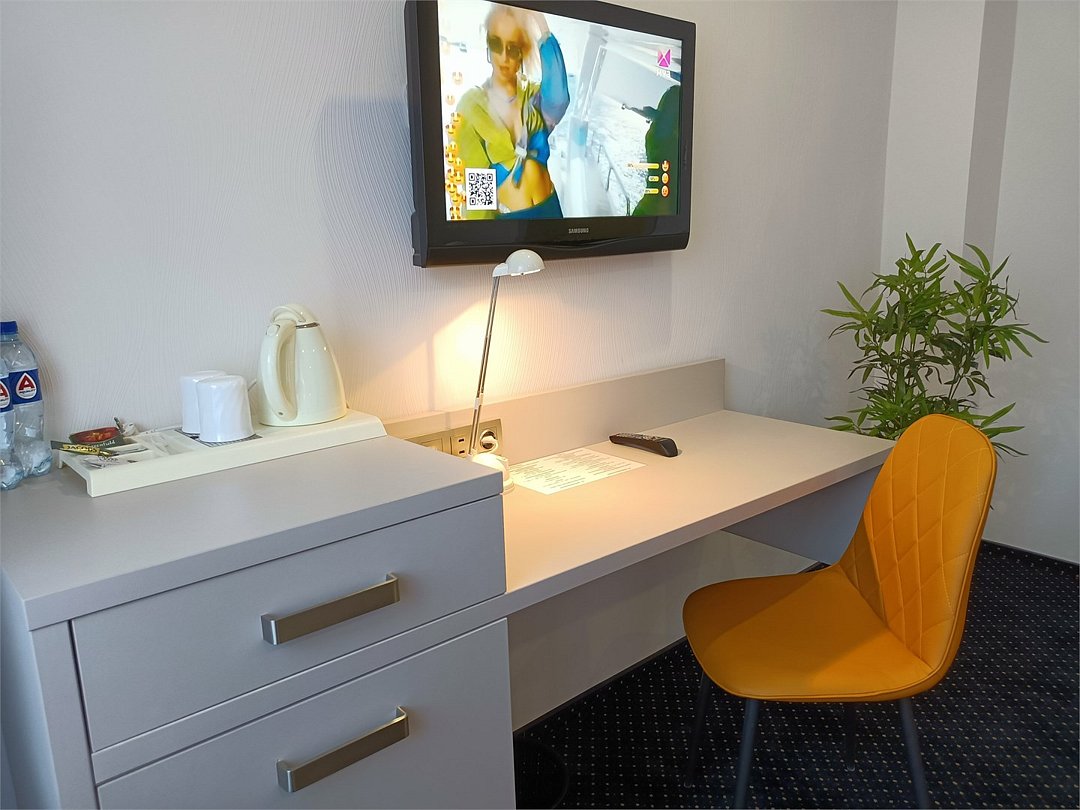 кабельное телевидение, Wi-Fi, телефон, кондиционер, светильник, настольные лампы, фен, ванна или душевая кабина, санузел, банные полотенца, двуспальная кровать, стулья, шкаф для одежды, вешалки, письменный стол, багажная тумба, зеркало, письменные принадлежности, чайный набор, питьевая вода, ковровое покрытие, отопление, вид на город, кулер на этаже, стаканы, столовые приборы, стул, тумба, телевизор с плоским экраном, мини-холодильникВ гостиничном номере