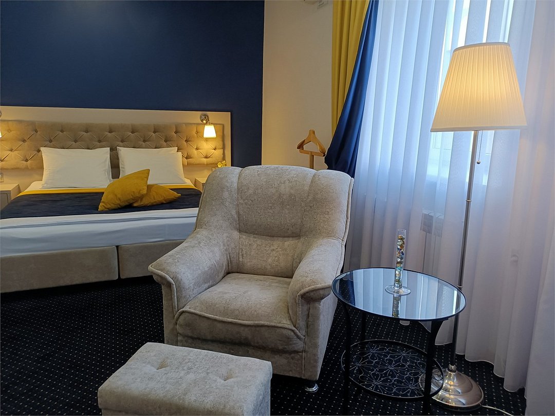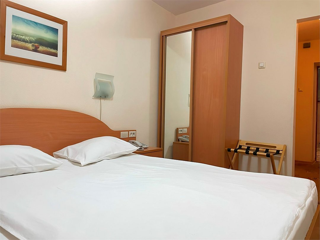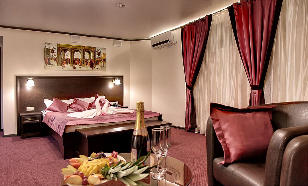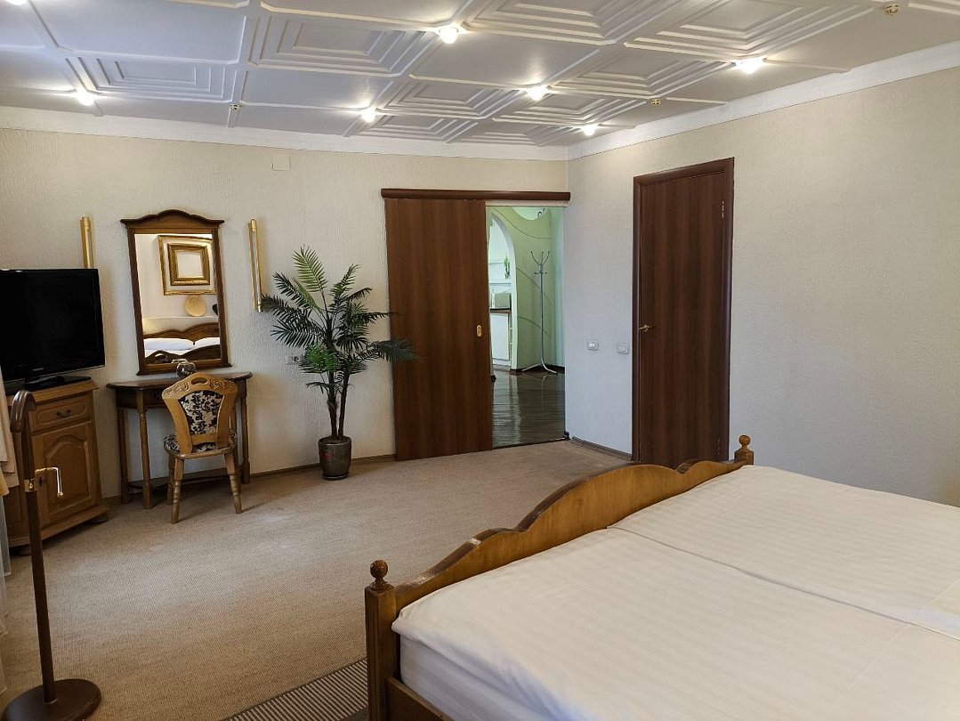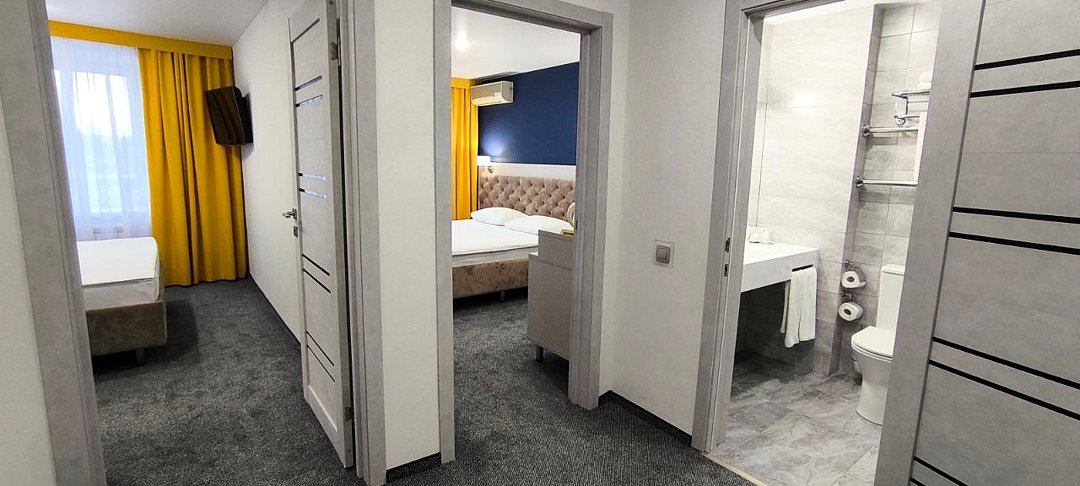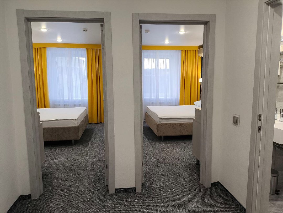 Просторный двухкомнатный номер для раздельного проживания двух человек или семьи (35 кв.м). В КАЖДОЙ комнате двуспальная кровать, телевизор, чайная станция, холодильник и кондиционер. В номере ОДНА ванная комната с душем. В наличии фен, шампунь, гель для душа, жидкое мыло и два комплекта полотенец. В стоимость проживания уже включены два завтрака «шведский стол», беспроводной интернет и охраняемая парковка. Чай, сахар и бутилированная вода обновляются каждый день.Услуги и удобства