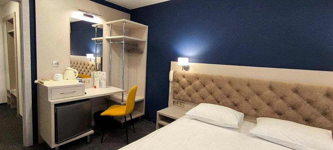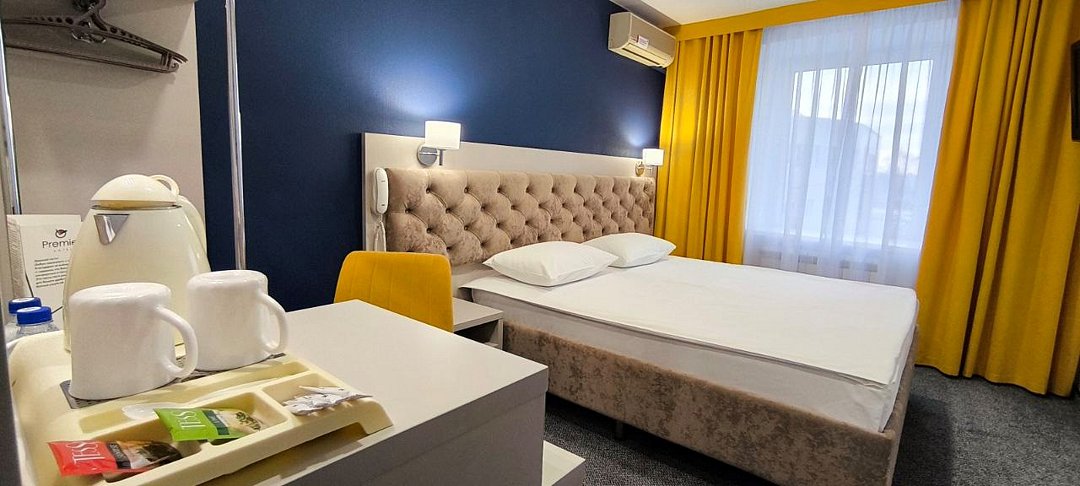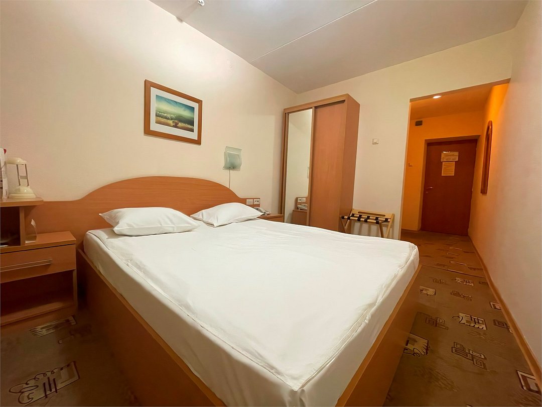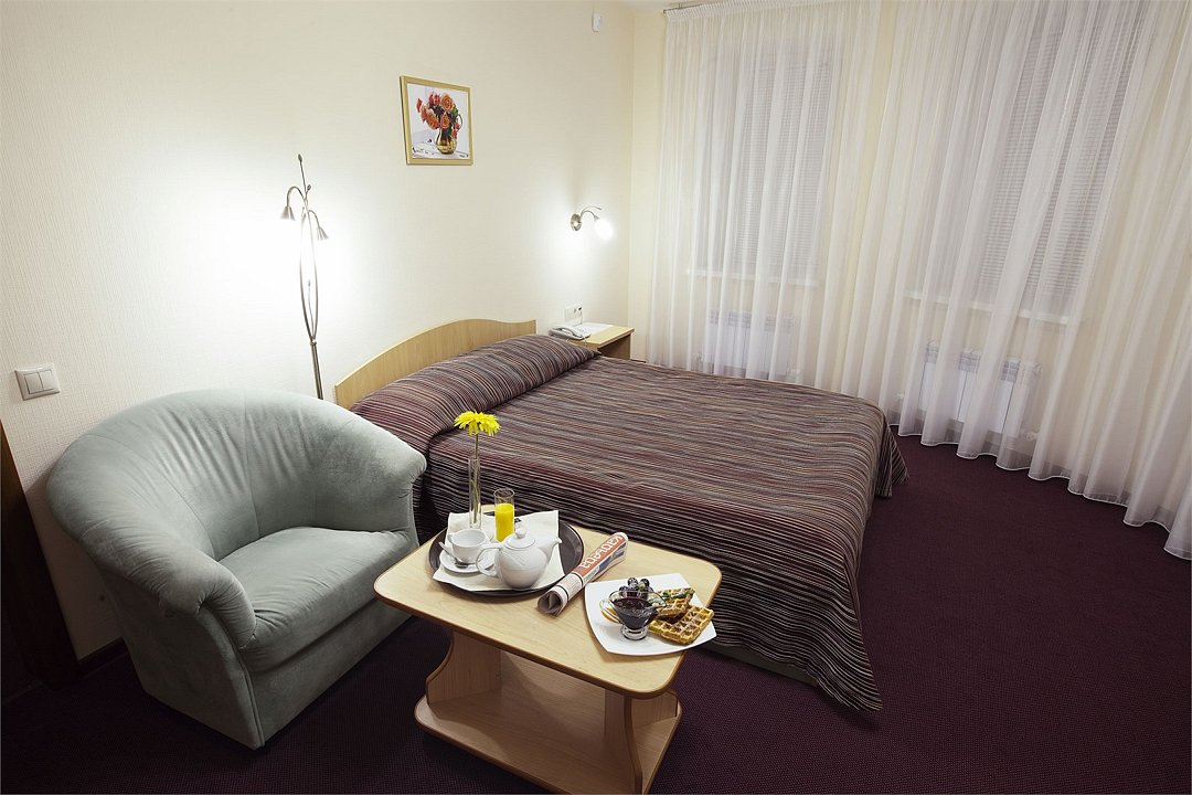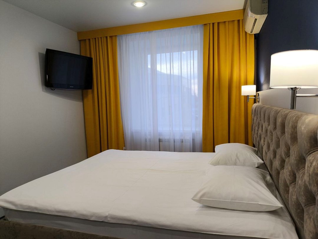 Уютный однокомнатный номер (17 кв.м.) с двуспальной кроватью. В комнате двуспальная кровать, телевизор, чайная станция, холодильник и кондиционер. В ванной комнате в наличии фен, шампунь, гель для душа, жидкое мыло и комплект полотенец. В стоимость проживания уже включен завтрак «шведский стол», беспроводной интернет и охраняемая парковка. Чай, сахар и бутилированная вода обновляются каждый день.Услуги и удобства
