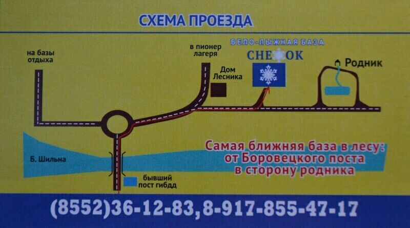 Вело-лыжная база отдыха «Снежок» находится в национальном парке «Нижняя Кама» недалеко от города Набережные Челны. База располагает двухэтажными домами, в которых можно арендовать отдельные комнаты. Гости, которые хотят отметить на природе свой праздник, могут воспользоваться вместительным банкетным залом, который есть на каждом этаже. В комнатах есть все необходимые удобства, мебель, кухонные принадлежности.