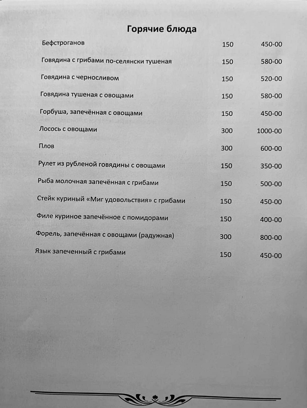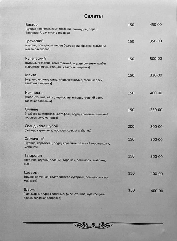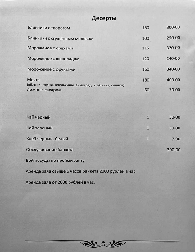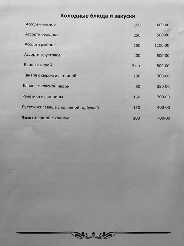 В меню: бутерброды, холодные закуски, салаты, первые, вторые блюда, горячие закуски, десерты, безалкогольные напитки. Алкогольные напитки Ваши собственные, разрешаются свои напитки и фрукты.