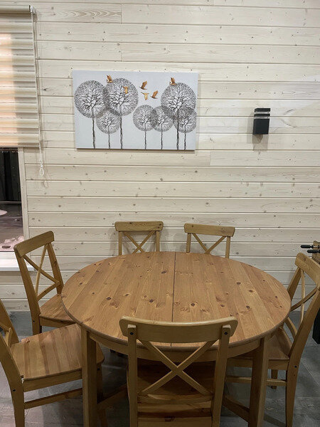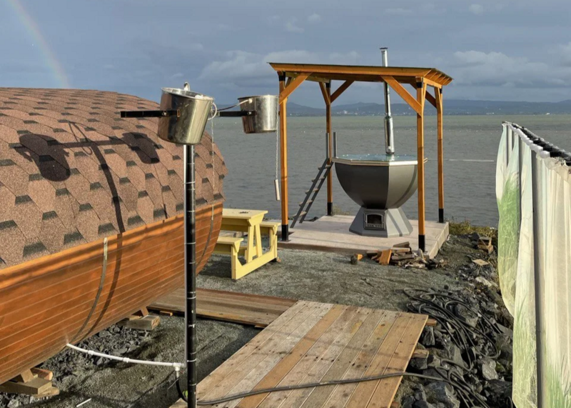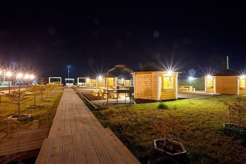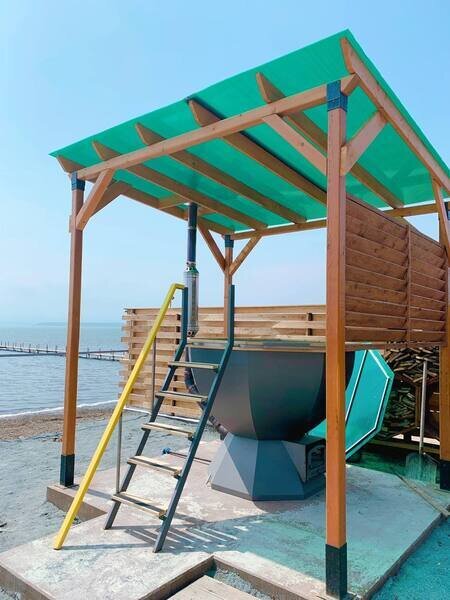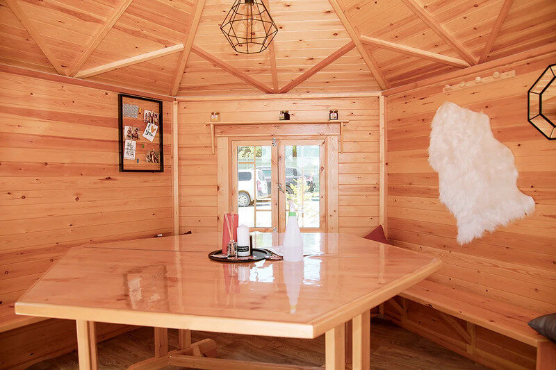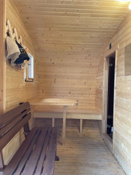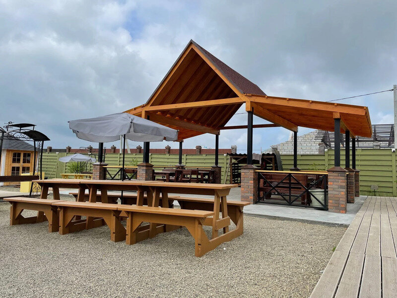 Финская беседка с теплыми полами и мангальной зоной согреет вас в промозглую осень, суровую зиму, свежую весну и пасмурное приморское лето. Рассчитана на 12−15 человек.