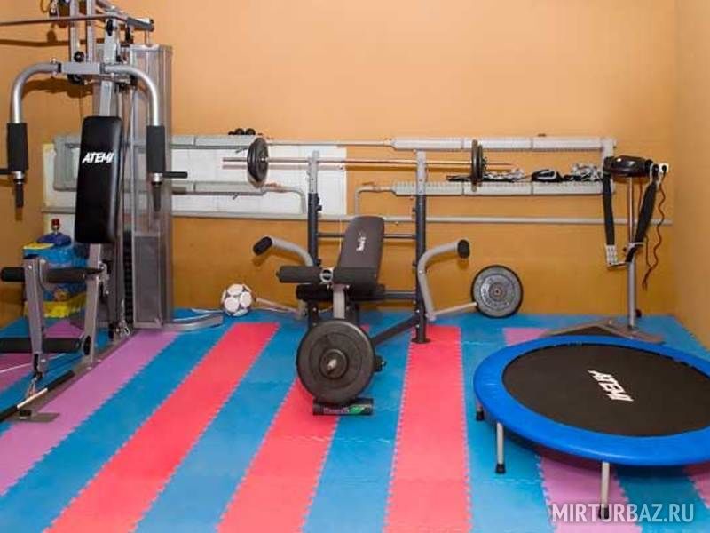 В зале: силовой тренажер; беговая дорожка; массажный тренажер; степлер; штанга; гантели; стойка для пресса и жима штанги.