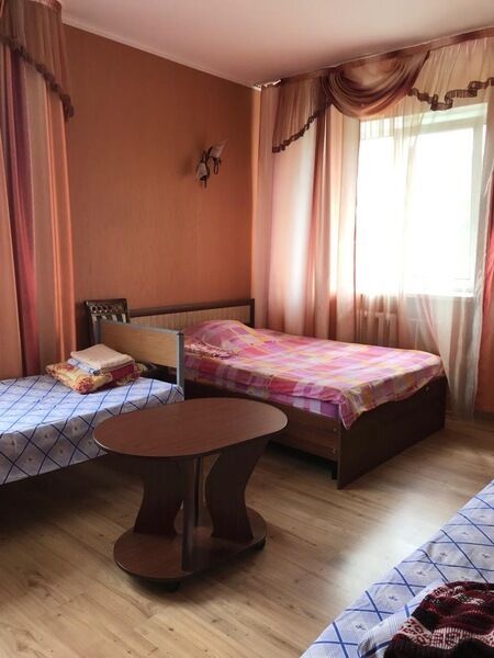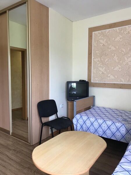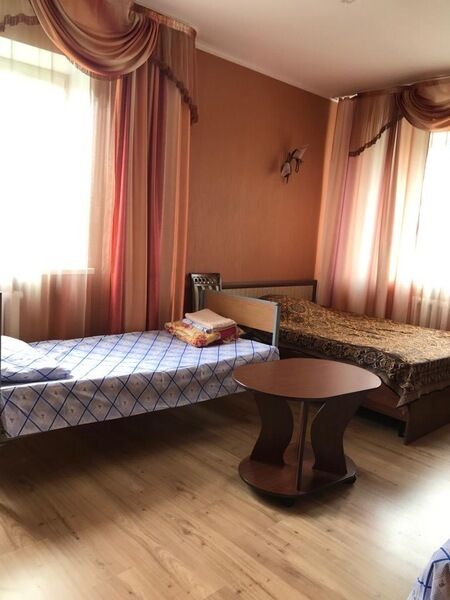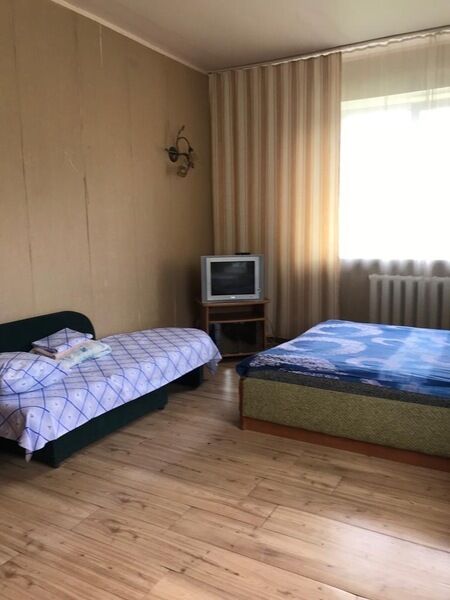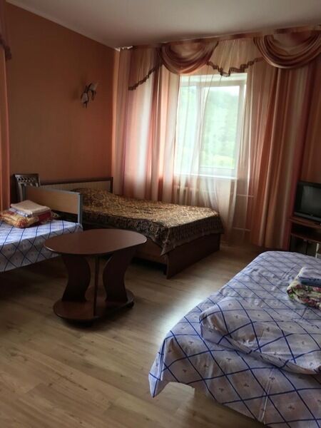 В номере: 3 кровати; раскладной диван; шкаф-комод; ТВ тумба; ТВ; холодильник; кондиционер; ковер; лоджия-стол, 2 стула.
