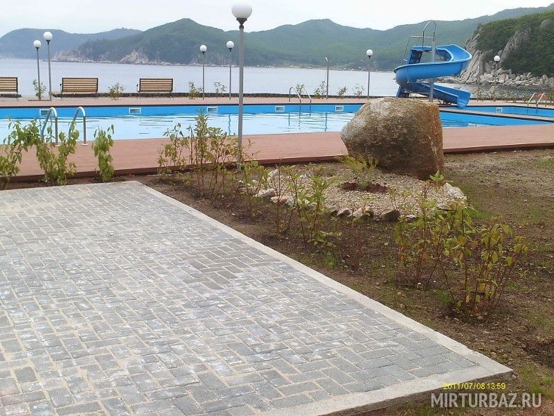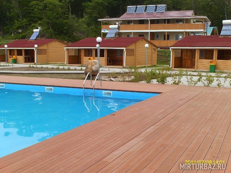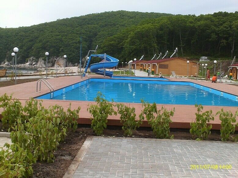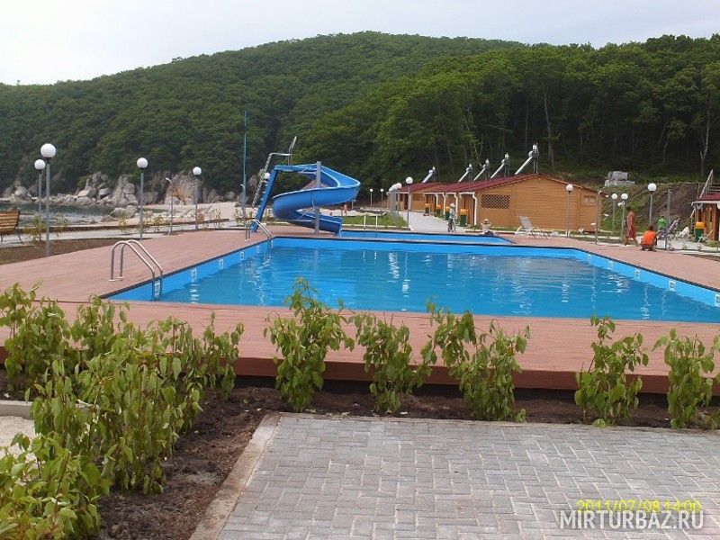 На территории базы работают 2 открытых бассейна: взрослый - 20*10 м, и детский - неглубокий бассейн размером 7*7 м с водяной горкой.